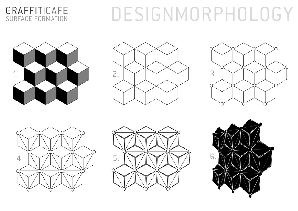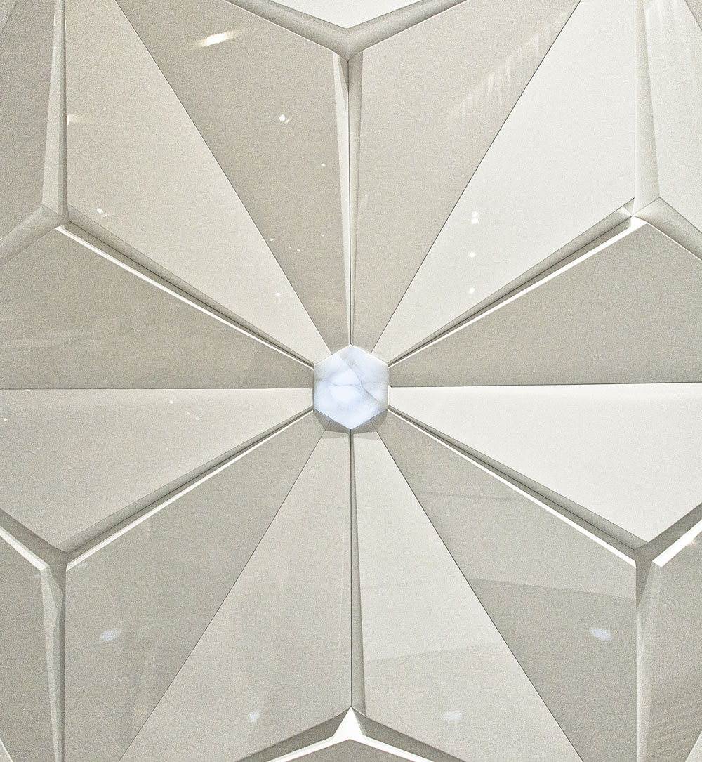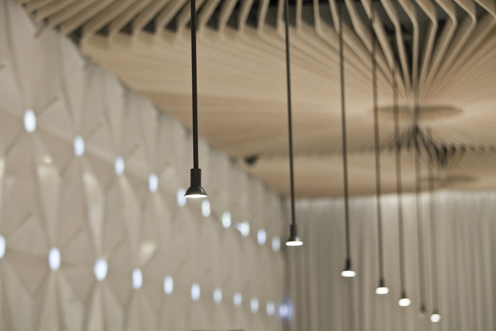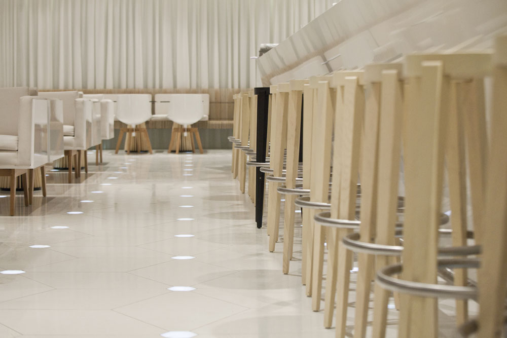 Tento vizuálne silný prvok neruší čistý a minimalistický dizajn ďalšieho zariadenia kaviarne, ktoré tvoria biele pohovky a kreslá, a čierne a biele stoličky. Zaujímavým prvkom je však podlaha, ktorá svojou jednoduchosťou zosilňuje dojem lupeňov, nie však nudne. Vizuálne nadväzuje na prelamované dizajnové steny a je podobne ako ony, presvetlená diódami v miestach, kde sa stretávajú línie kosoštvorcových prvkov.