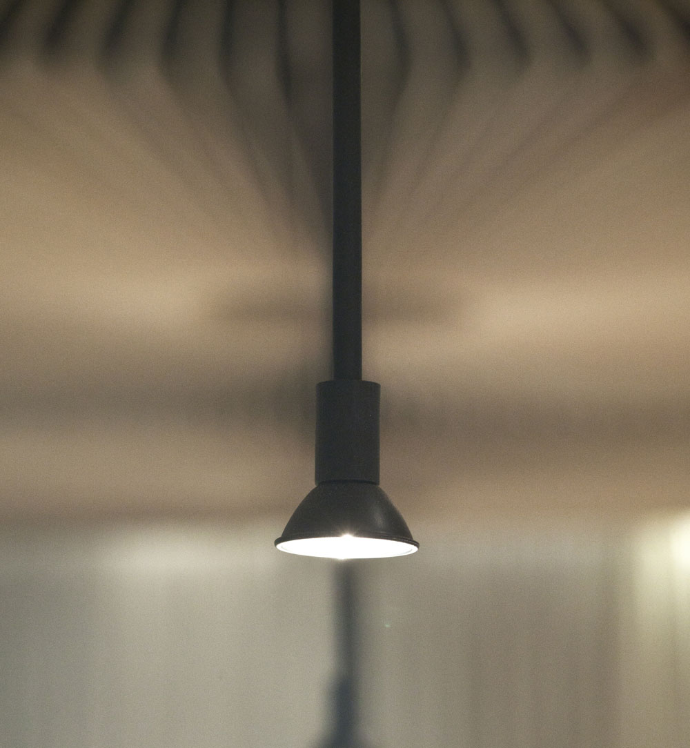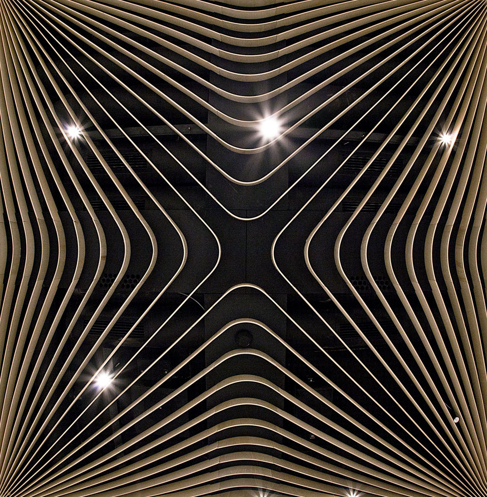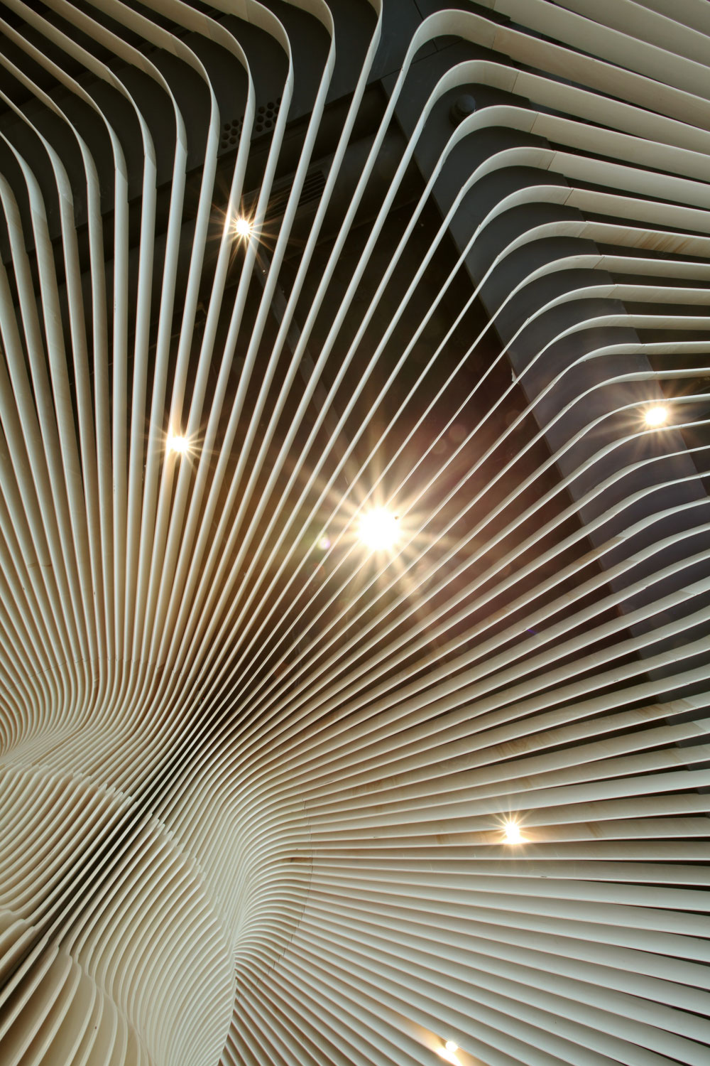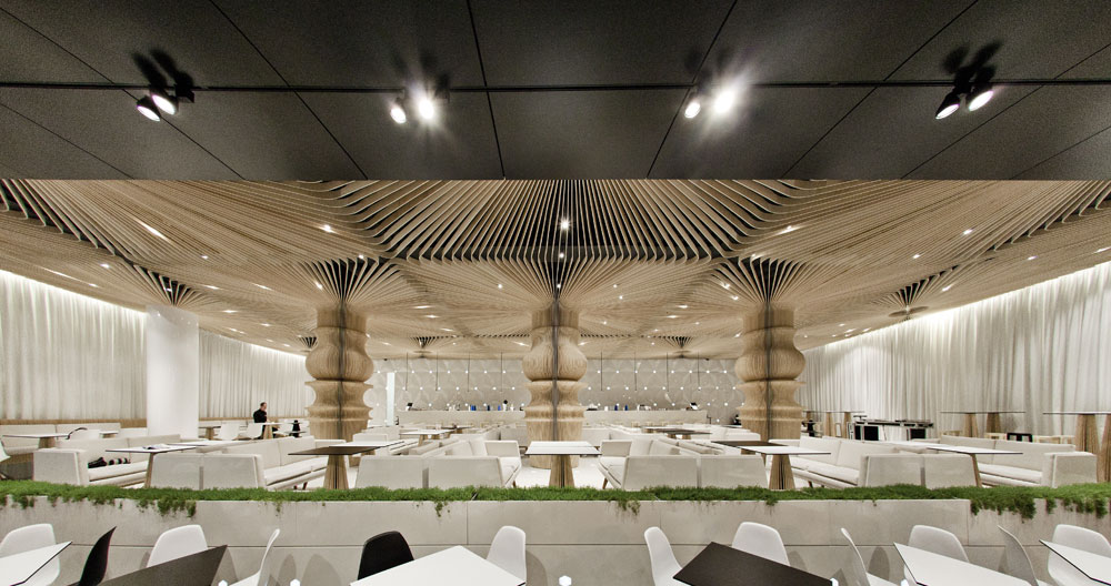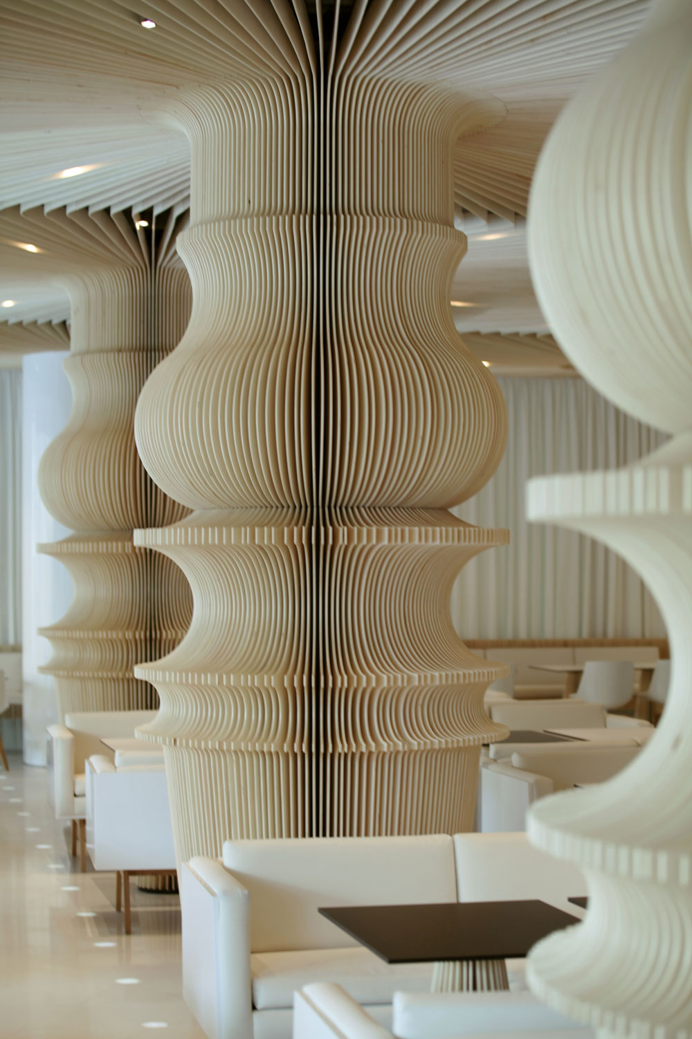 Najsilnejší dojem však vyvolávajú lupene z ohýbanej preglejky, pokrývajúce piliere a strop. Piliere sú lupeňmi obalené tak, že pôsobia dojmom monumentálnych, ale ľahkých stĺpov, takmer papierových. Tento dizajnový prvok umožnil ukryť všetky inštalácie a technické prvky a zároveň je dobrým akustickým riešením. Pokrýva nielen strop a piliere, ale aj nábytok – nohy stolíkov. Lupene tak evokujú nielen otvorenú knihu, ale napríklad aj lupene lesných húb.