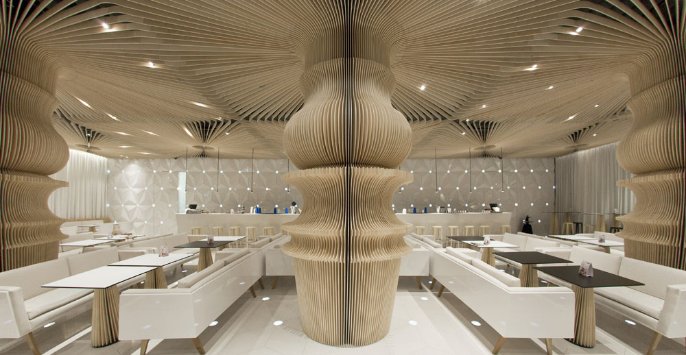 Ak navštívite bulharskú Varnu, skúste zájsť na kávu do Café Graffiti s orginálnym dizajnom Studia Mode. Nábytok aj strop tu tvoria lupene z preglejky.