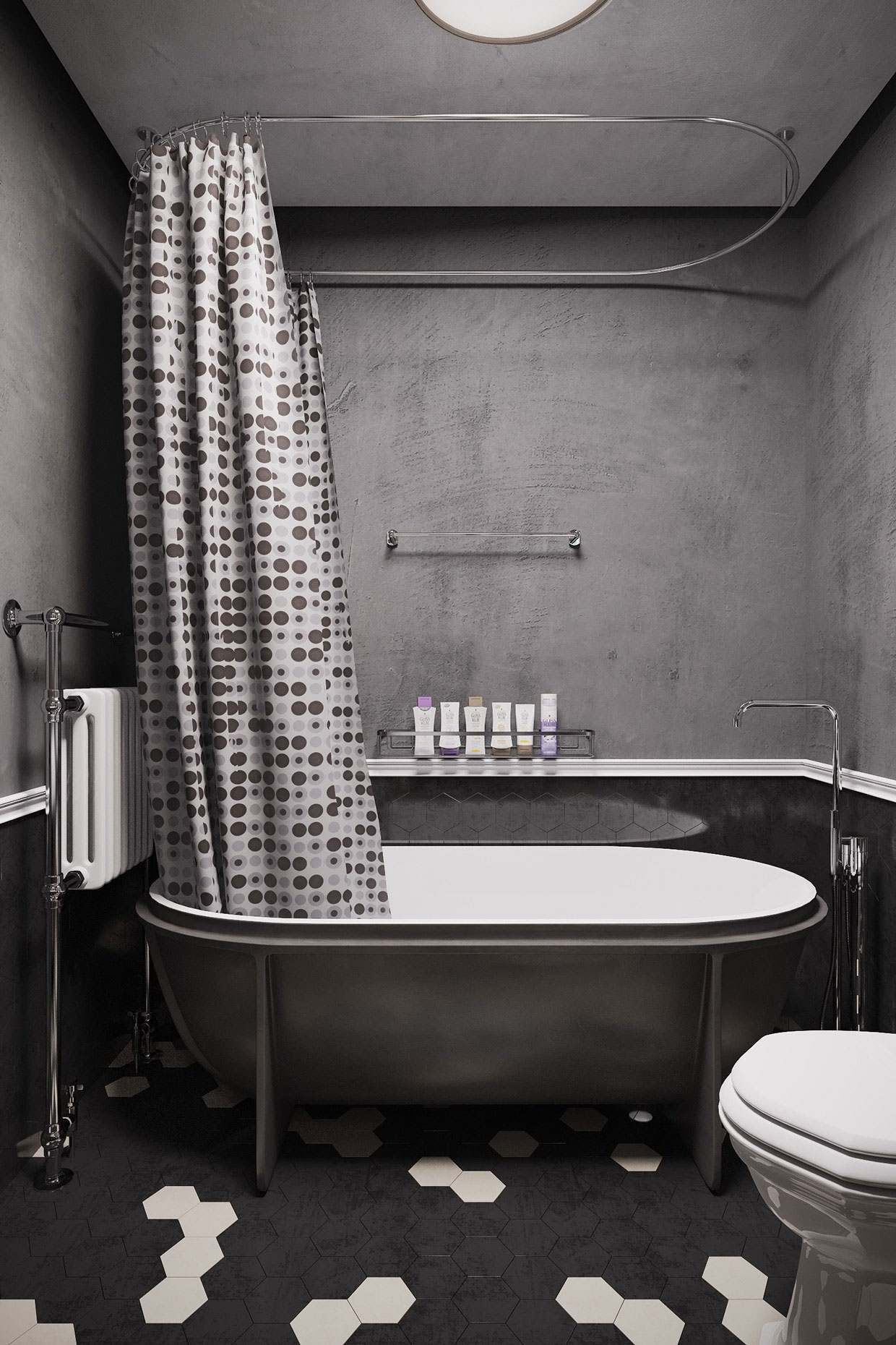 Tá sa absolútne vymyká tradične zaužívanému stereotypu, ktorý vyjadruje, že kúpeľňa má už na prvý pohľad pôsobiť relaxačným, prívetivým dojmom a poskytovať upokojujúcu paletu farieb a tvarov. Krasikova predstava sa pretavila do ťažko industriálnej, až surovej miestnosti, v ktorej dominujú tmavosivé steny, jednoduchosť a funkčnosť. Jediným osviežením je vzor na vaňovom závese a nepravidelne striedavé hexagonálne kachličky v monochromatickej súhre.