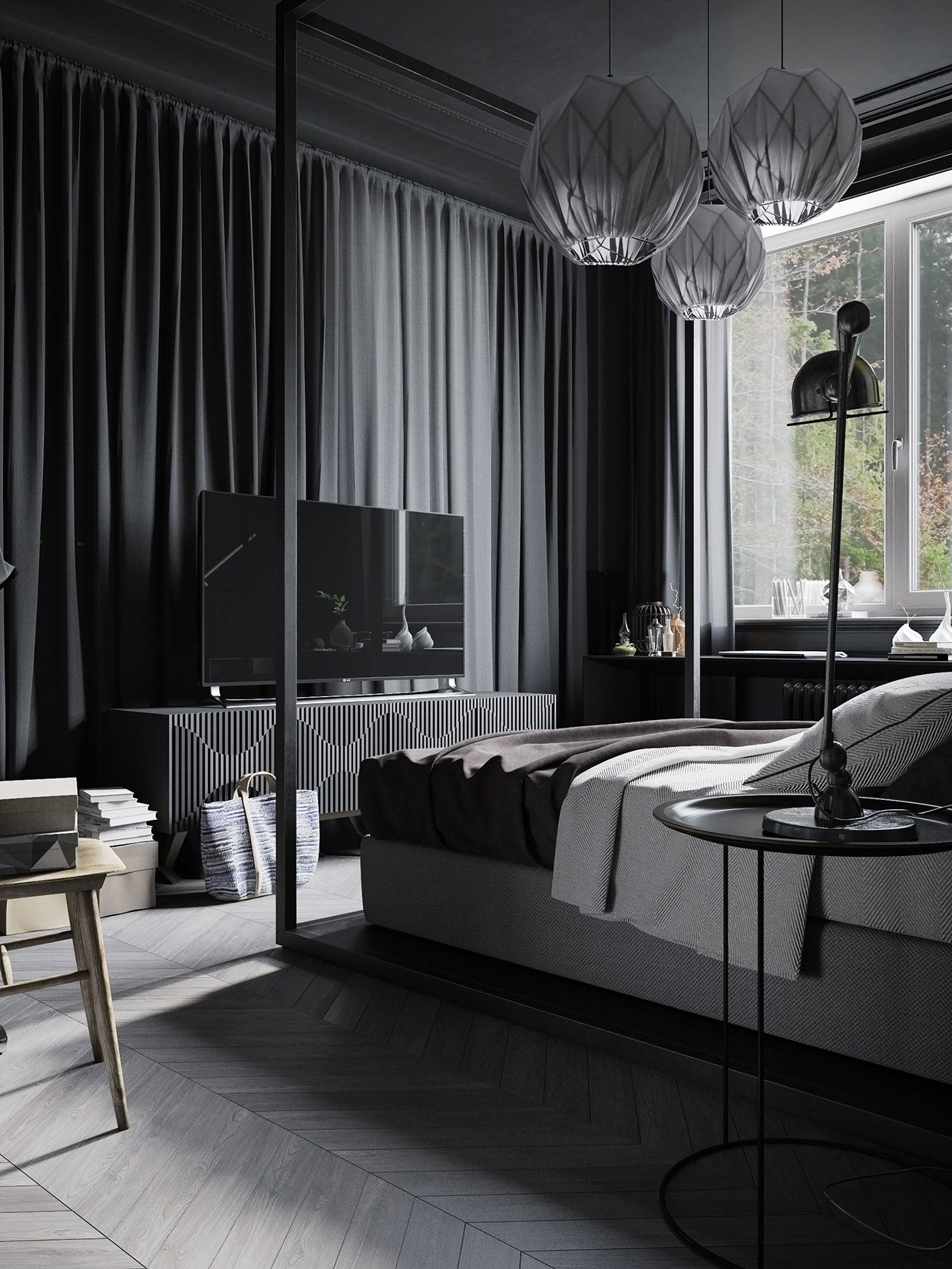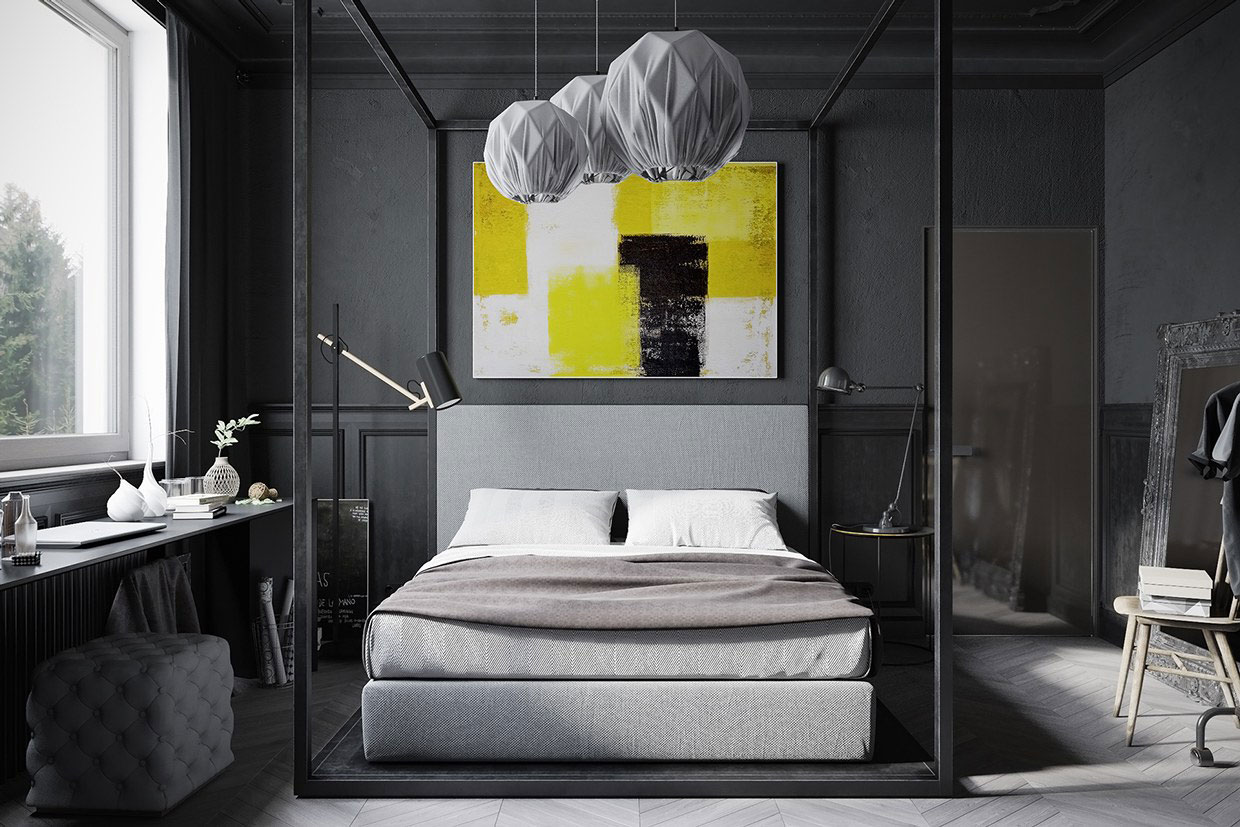 Spálňa je evidentne mužská – vyjadrujúca mladú sviežu nezávislosť, dravosť a voľnosť. Širokú paletu sivých odtieňov a bielych doplnkov dopĺňa ústredný umelecký motív – abstraktný veľkoformátový obraz sviežich limetkových tónov v kombinácii s čiernou a bielou. Tento prvok dodáva izbe iskru a rozjasňuje odvážny priestor. Doplnky s nádychom starých dobrých čias (stolička, rám so zrkadlom či taburetka) zjemňujú celkovú dramatickosť tmavých stien a stropu.