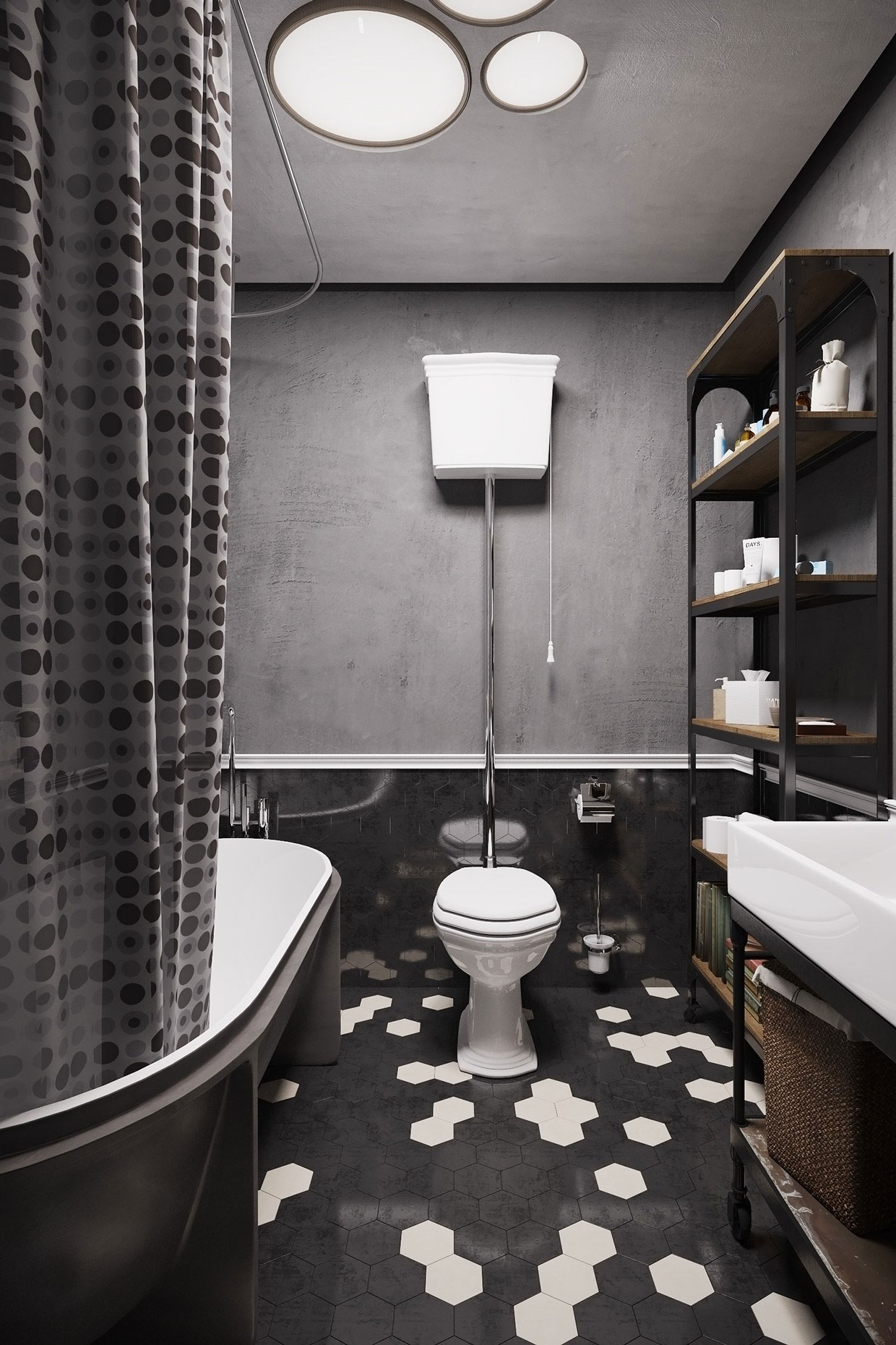 Ani biela sanita, strohé osvetlenie a kovový nábytok nepridávajú miestu prívetivý podtón. Avšak v komplementarite s ostatnými miestnosťami bytu je kúpeľňa veľmi výstižným a jasným vyjadrením životného štýlu obyvateľa – bez zbytočných okrás plní svoju funkčnosť a prináša jednoduchý a priamy priestor, v ktorom nie sú vzhľadom na povahu interiéru potrebné žiadne ďalšie prvky.