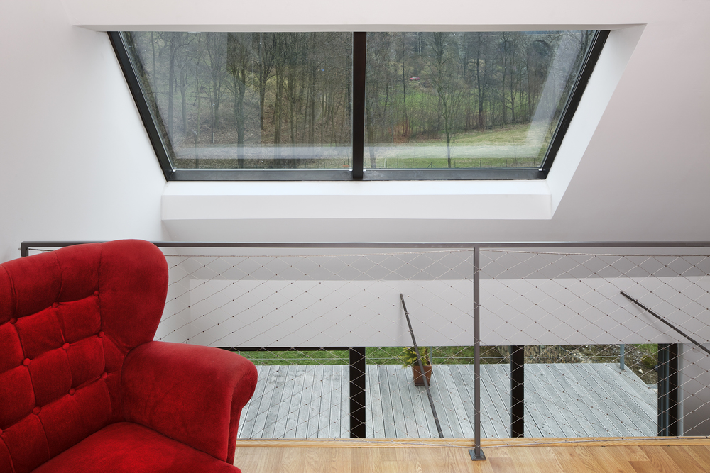 Najvyššie podlažie skrýva v strede kúpeľňu, po ktorej stranách je spálňa a pracovňa s galériou do obývacej izby. Obe miestnosti ponúkajú vďaka veľkému zaskleniu krásny výhľad a dostatok prirodzeného svetla. Nachádza sa tu aj komora a strojovňa vzduchotechniky.