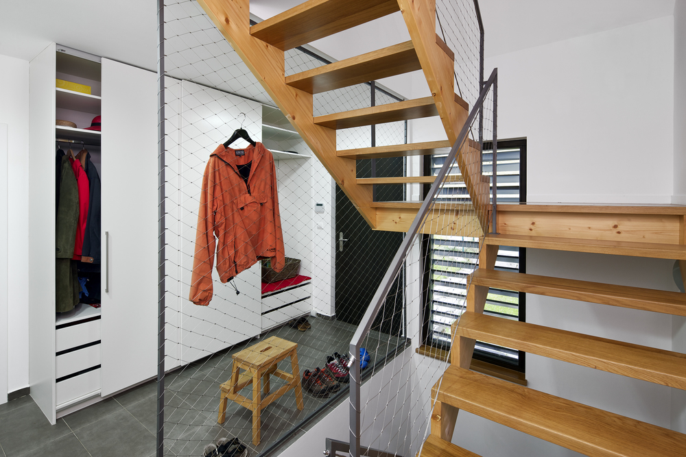 Architekt šikovne zahrnul nielen požiadavky a nároky majiteľov a špecifiká vyplývajúce z faktu, že pozemok je tesne nad hranicou pamiatkovo chráneného územia. Vznikol projekt domu, ktorý má doslova dve tváre – z ulice pôsobí ako nízka jednopodlažná nenápadná chalupa so sedlovou strechou, bridlicovým obložením a malými oknami, avšak do súkromia záhrady sa otvára veľkoryso zasklená trojpodlažná vzdušná stavba.