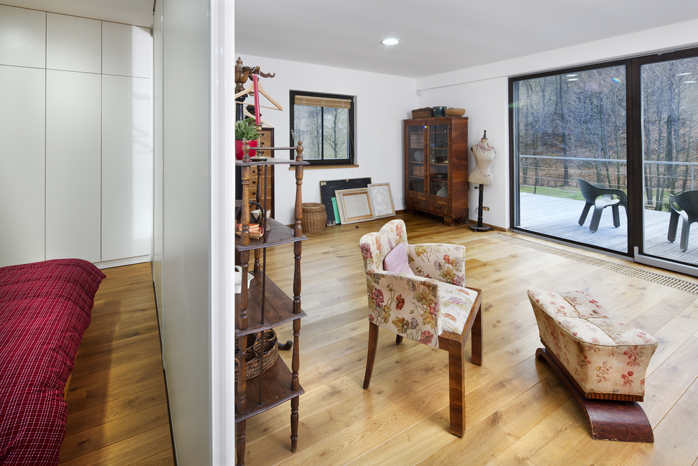 V ľavej časti domu sa nachádza menšia obývacia izba s kuchynkou a s posuvnými priečkami oddelená spálňou. Nechýba vlastná priestranná kúpeľňa. Táto časť sa dá používať ako samostatný minibyt.