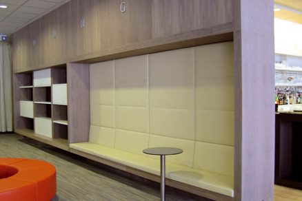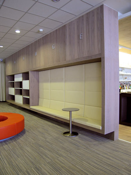 Barový pult priestorovo súvisí s pozíciou nábytkovej steny so sedíliami a knižnicou, ktorá svojou hmotou kryje vstupy do toaliet. Zvyšný priestor je zariadený dvoma typmi sedenia. Pred barom je umiestnené polokreslové sedenie, ktoré môže slúžiť ako doplnkové stolovanie pri zvýšení kapacity reštaurácie. Pozdĺž okna hotelovej haly je potom situované sedenie z klubových kresiel a nízkych stolíkov.