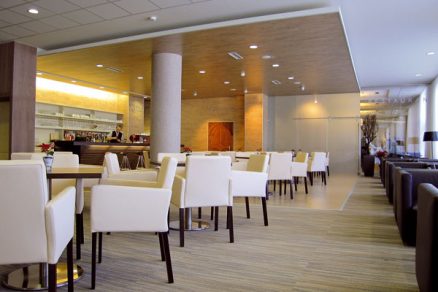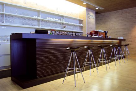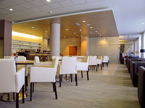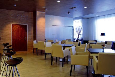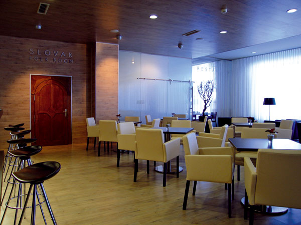 | Kaviarenské sedenie rozširuje kapacitné možnosti stravovania hotelových hostí, pričom samotná reštaurácia je s kaviarňou vizuálne prepojená vďaka bezrámovému zaskleniu. | Zóna baru a kaviarne je vizuálne definovaná nielen podlahou, ale aj stenami a zníženým stropom z drevodekorových laminátových pásov. V priehľade vidno prepojenie s reštauráciou. |