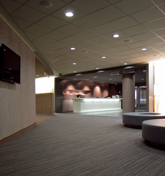 Priestor recepcie je materiálovo a farebne vyčlenený z hotelovej haly. Podlahu i steny tvorí kamenný obklad zo sivej žuly, znížený hladký strop sa farebne prispôsobil farebnosti kameňa. Recepčný pult je dizajnovo podobný s barovým, ibaže je kontrastne biely. Je umiestnený pred novú predsadenú stenu s nikou a vstavanými skrinkami. Tak ako na barový pult nadväzuje nábytková stena, tak aj recepčný pult je priestorovo previazaný s nábytkovou stenou s vitrínami a miestami s pripojením na internet. Nábytková stena zároveň oddeľuje novú rampu od pôvodných, ale rozšírených vyrovnávacích schodov.