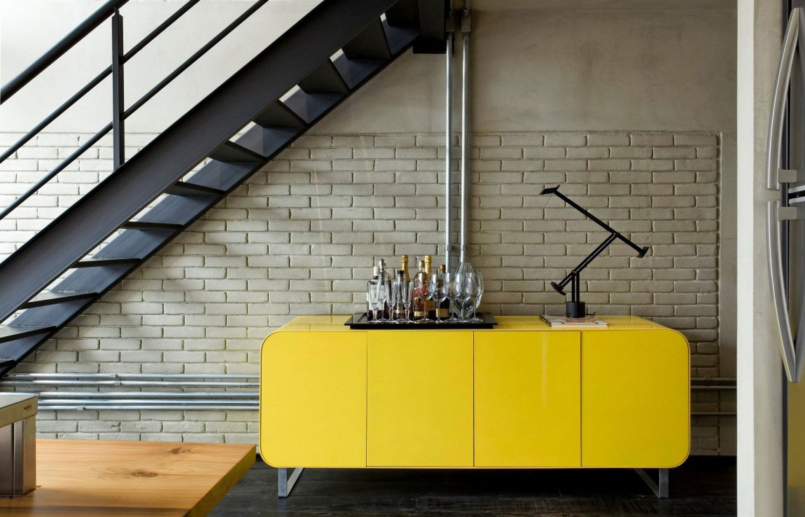Farebná škála je vysoko maskulínna, od čiernej cez sivé tóny až po krémové odtiene a drevné dekory doplnené silným akcentom žltej v podobe dizajnovej komody v dolnom obývacom priestore.