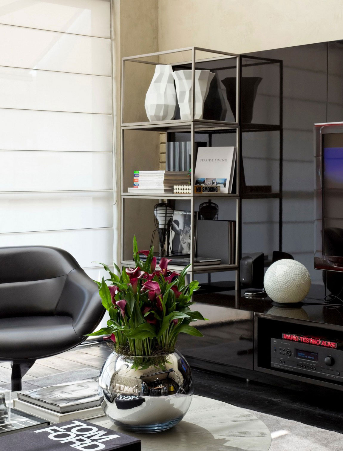 Jednoduchú kúpeľnu oživuje kombinácia bielej a čiernej sanity, nábytok spálne aj šatníková skriňa sú v lesklom čiernom vyhotovení. Celý priestor je zaujímavo podporený množstvom zrkadiel rôznych formátov, vďaka čomu sa umocní dojem priestrannosti a plasticity.