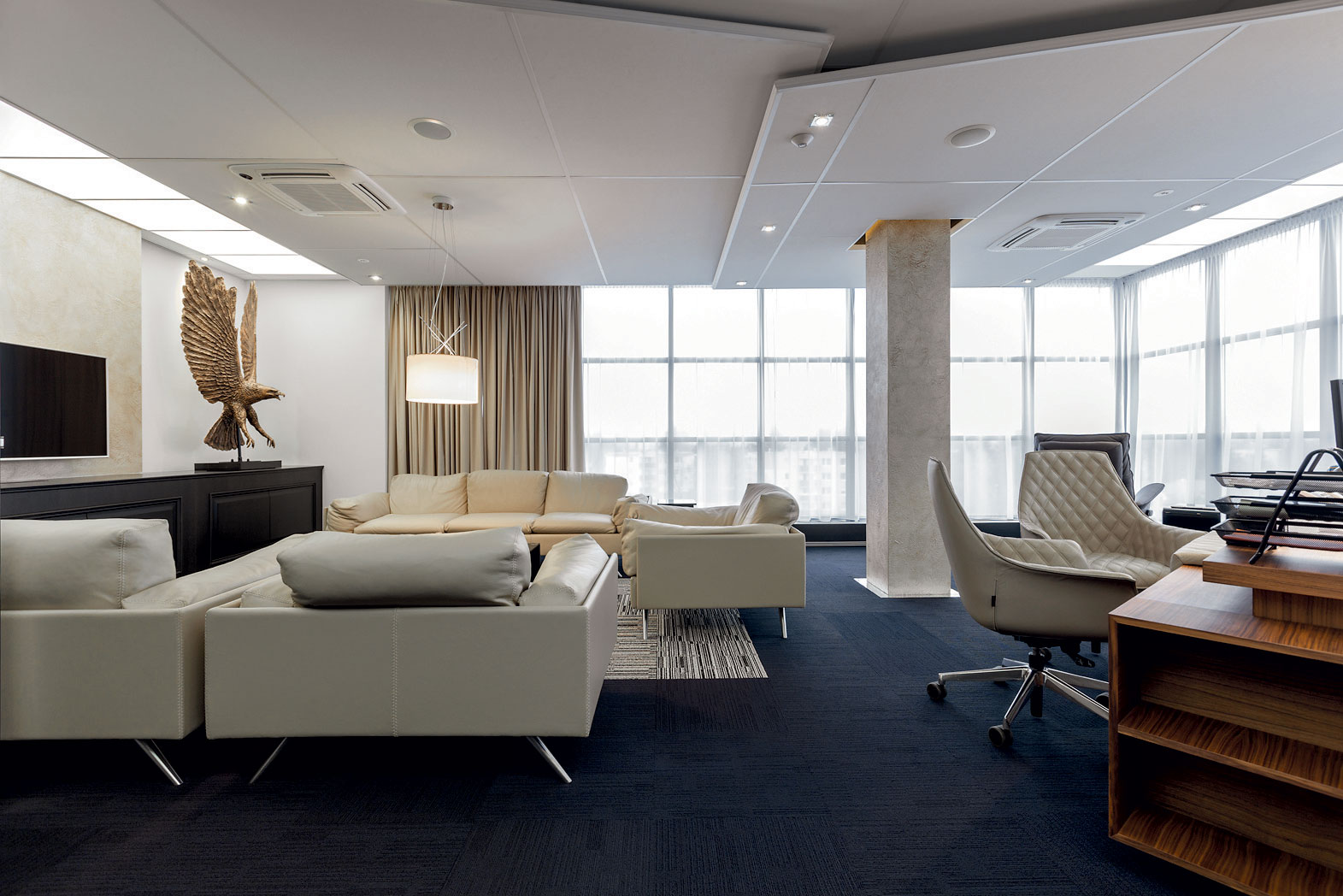 Kancelárie jednotlivých pracovníkov sú zariadené relatívne jednoducho, ale funkčne. Dôležitú úlohu v nich hral samotný priestor, aby nepôsobili stiesnene, ich rozloha je okolo 15 m2. Vedenie má v každej kancelárii aj malé sedenie na rokovanie s klientmi v súkromí, ktoré je pre spoločnosť prioritou. Aj z tohto dôvodu sú firemné priestory riešené ako oddelené kancelárie. Aby priestor ostal vzdušný, dvere do kancelárií sú sklenené, avšak s pásom mliečneho skla. Nevšedným dojmom pôsobí aj zasadacia miestnosť. Hoci trendy kancelárskych priestorov velia zvoliť jednoduchú farebnosť a čisté línie, v tomto prípade sa architekti nebáli experimentovať a v okázalom duchu ostatných firemných priestorov vybrali pre zasadačku výrazný koberec, ktorý priťahuje pozornosť. „Ľudia sa často pozerajú do zeme, tak sme sa snažili vybrať vzor, na ktorý možno uprieť zrak. Ostatne, práve tento vzor v rôznej intenzite a farebnosti variuje vo všetkých priestoroch,“ vysvetľuje Michal Pasiar.