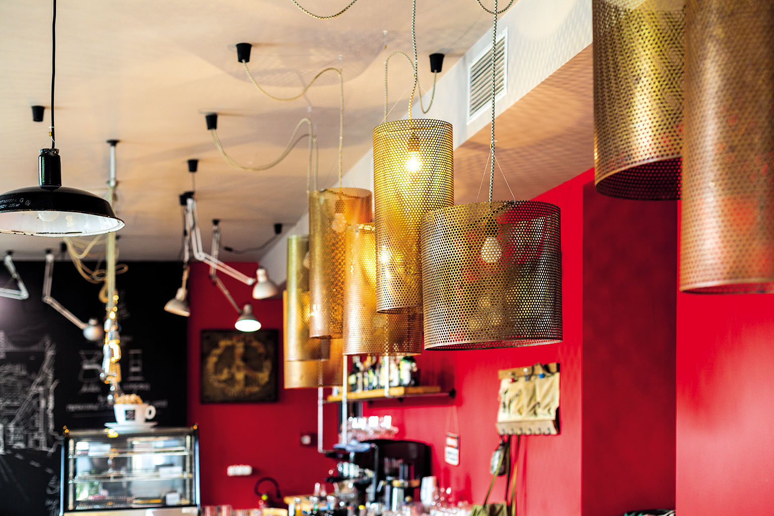 Koncept zariadenia sme si pripravovali už v Nitre, hneď ako sme mali k dispozícii pôdorys priestoru. Od začiatku sme chceli použiť inštalačné rúrky ako originálny prvok pri výrobe zariadenia a drevo, ktoré by interiér zútulnilo a preteplilo. Červená farba ako korporátny znak celej budovy bola daná, rovnako aj názov kaviarne.“ To uľahčilo celý štart, pretože vymyslieť dobrý názov podniku je veľmi ťažké, na druhej strane, červená farba je taká výrazná a dominantná, že nepotrebuje ďalšie, aby jej sekundovali. Stena za barom a niekoľko doplnkov sú teda červené, dopĺňa ich len veľká plocha natretá čiernou tabuľovou farbou, ktorá slúži ako pútač. „Píšeme na ňu aktuálnu ponuku a slúži nám ako premenlivý prvok. Myslíme si, že je dôležité, aby aj stáli zákazníci cítili drobné zmeny, čo osviežia známy priestor,“ dopĺňa Zdenko Kysučan.