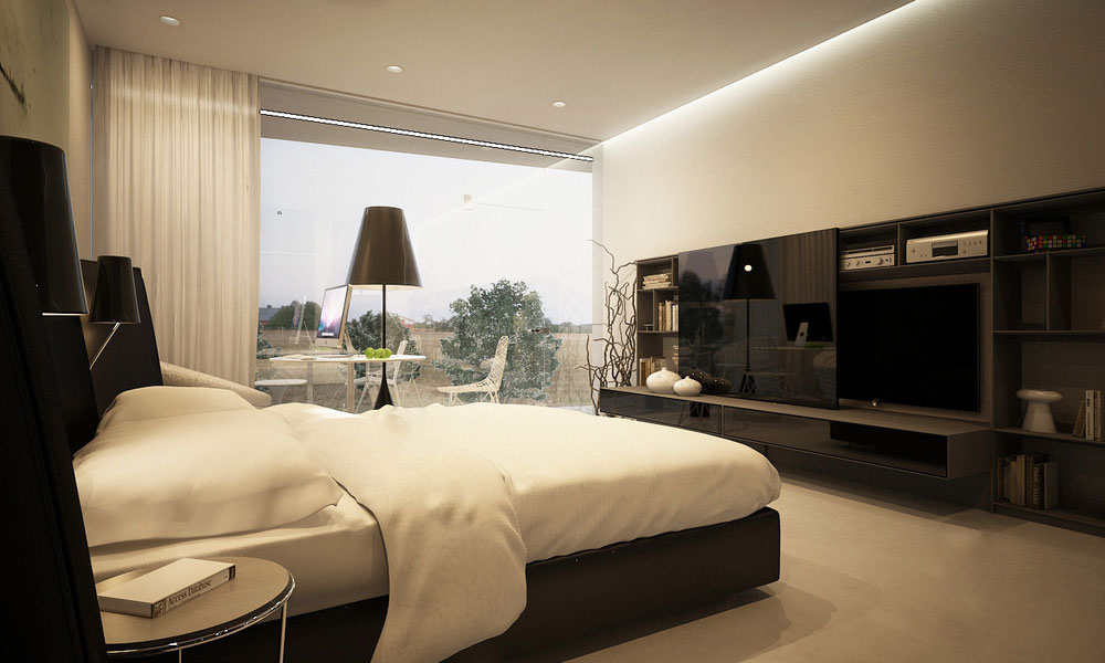 Hlavná spálňa je zariadená jednoducho, účelne, prostredníctvom sklenej fasády ponúka nerušený výhľad na okolitý pozemok a je doplnená umeleckým kúskom pre navodenie pokoja a relaxu.