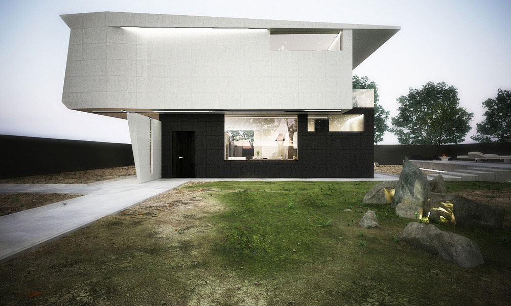 Dom je rozdelený do dvoch základných proporcií – základňa je kubického tvaru a tmavej farby, nadstavba kontrastnej svetlej farby oživuje projekt svojou atypickou dispozíciou