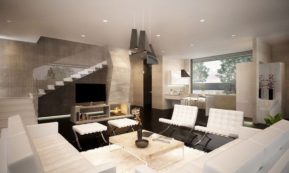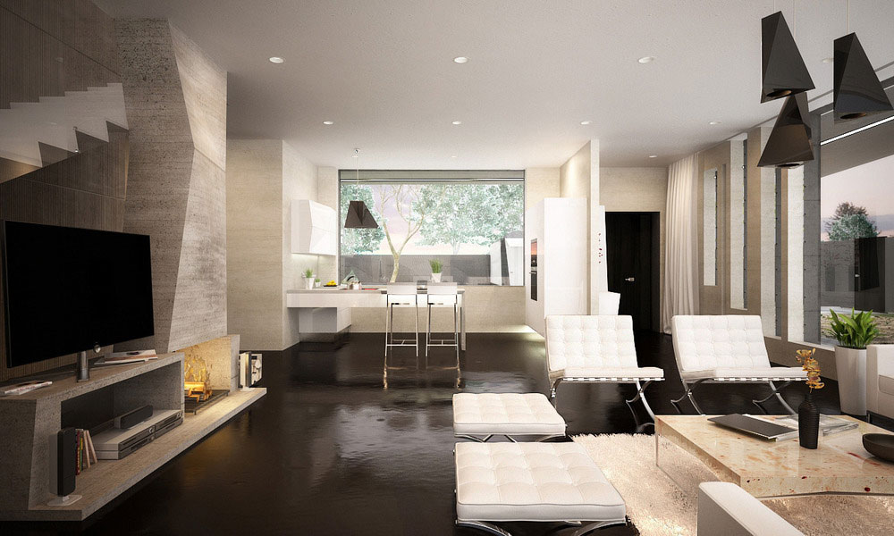 Tmavú lesklú podlahu dopĺňa biely nábytok a sklo. Koberec a krb dodávajú priestoru domácu útulnosť. Zariadenie je praktické a funkčné.