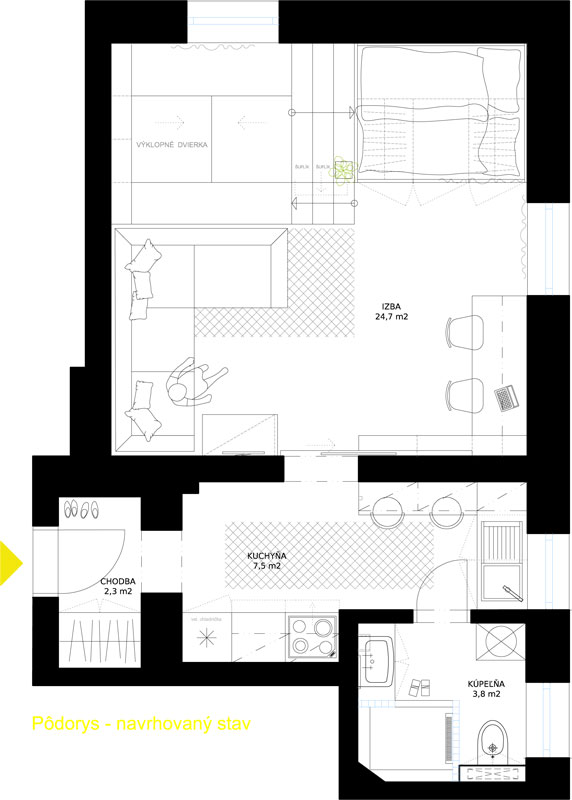 Dominantným bodom projektu je riešenie centrálneho priestoru bytu. Vytvorenie troch úrovní, ktoré riešia okrem funkčných zón aj odkladacie priestory, je výborným nápadom. V jednej miestnosti nájdete obývaciu izbu, pracovňu, čitáreň i spálňu zároveň. Samotná konštrukcia jednotlivých „poschodí“ je aj premysleným úložným priestorom, ktorý tvoria skrine, police, zásuvky či dokonca tajná komora.