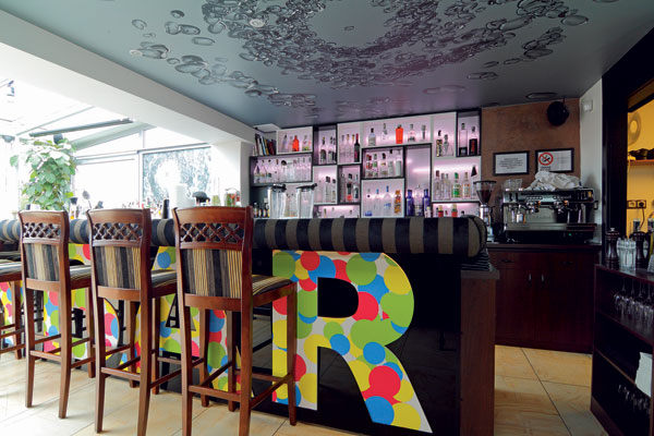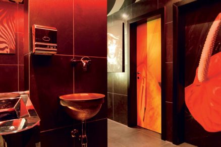 Aj keď sa zdá, že vyššie sa už ísť nedá, dá sa. Na streche posledného podlažia je malá VIP terasa, prenajímateľná aj na súkromné posedenia. Čím vyššie, tým lepší výhľad. Ani v Sky Bare nechýba malý detail, ktorý rozveselí svojím vtipným šarmom a aj tentoraz sa nachádza v priestore hygienického zariadenia – je ním podlaha so vzorom gumených medvedíkov. Štýl interiérových doplnkov je opäť elegantným mixom – výber poťahov na posedeniach a farby a vzoru tapety je originálny. Výrazné tapety, pásikavý poťah na posedení a nápadné stolčeky sa zdajú nezlučiteľné, napriek tomu spolu ladia, akoby to inak ani nemohlo byť. Pritom by stačila jemná odchýlka odtieňu a kompozícia by mohla ľahko prestať ladiť. Jemnocit pri výbere materiálov sa tvorcom interiéru rozhodne nedá uprieť. „Tvorba interiéru baru, kaviarne alebo reštaurácie je vždy výzvou,“ hovorí Helmut Käst. Dodáva, že takýto projekt môže pripomínať tvorbu filmovej alebo divadelnej scény. „Opak je pre mňa napríklad navrhovanie kancelárií, ktorých interiéry sú zvyčajne šablónovité a uniformné.“