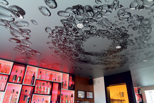 Vypracované podhľady sú ďalším zo spoločných motívov všetkých troch priestorov. „Podhľad je len ďalšou stenou a je neoddeliteľnou súčasťou riešenia priestoru,“ hovorí architekt Gubka. Dodáva, že pri návrhu priestoru Rum Clubu vznikol problém s nízkou svetlou výškou, takže podhľad zarastrovali tak, ako si to vyžadovalo nevyhnutné prekrytie inštalácií na dosiahnutie ilúzie vyššieho stropu.