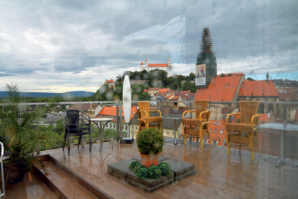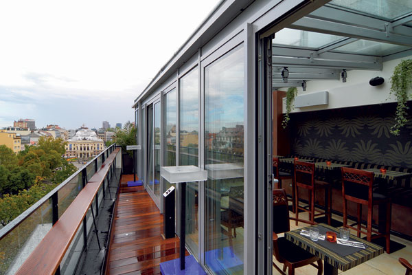 Ak je nálada hosťa povznesená, bude pre neho tým pravým miestom na relax Sky Bar Restaurant. Pohoda v centre mesta s výhľadom na Bratislavský hrad za pekného počasia môže byť neoceniteľná. Sky Bar sa nachádza na najvyššom poschodí budovy a na jej streche. „Technické riešenia tohto poschodia boli náročné, pôvodne sme mali v pláne na tomto poschodí vybudovať zasklenú kocku,“ hovorí architekt. Dodáva však, že určujúcimi kritériami bola hodnota budovy ako pamiatky a, samozrejme, rozpočet. Výsledok však nestratil nič zo svojho čara aj napriek kompromisu. Priestor je aj tak ohraničený len sklenenými stenami, ktoré sa navyše dajú takmer celé pootvárať. Vytvorí sa teda súvislý priestor, ktorý sa spojí s terasou. Tá sa dvakrát do mesiaca stáva scénou pri nakrúcaní relácie Na streche Oľgy Záblackej.