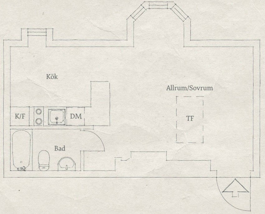 Pôdorys naznačuje, že hlavná obytná časť bytu je prepojená – v jednom priestore nájdeme kuchyňu, obývačku aj spálňu. Stenou je oddelená iba kúpeľňa spojená s toaletou, ktorá sa nachádza vedľa kuchyne. Otvorenému priestoru dodáva plastickosť vysoký atypický strop.