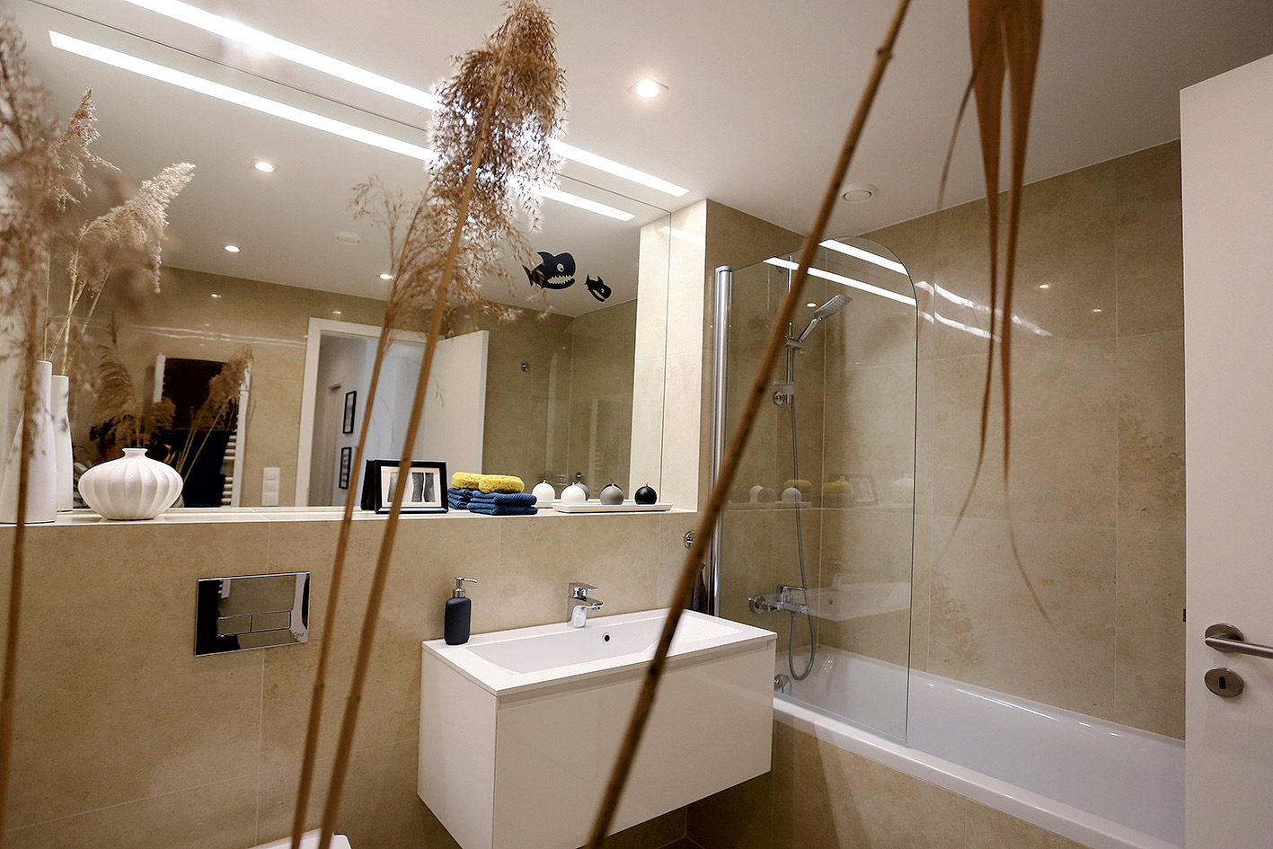 Byt má síce vzdušných 98 m2, ale je na ňom vidno, že sa zohľadňoval každý štvorcový meter. Pri tvorbe interiéru sa mierne menila aj dispozícia bytu, čo sa najviac prejavilo pri zväčšení kúpeľne ako relaxačného miesta. Aj preto sa odtiaľ vytiahla práčka do samostatného priestoru za zásuvnými dverami a z kúpeľne zostala oáza pokoja s veľkou trstinovou kyticou a snivou atmosférou.