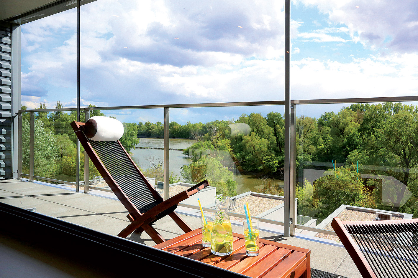 Stena z drevených lamiel s bylinkovou záhradou je akousi príručnou zásobarňou pre kulinárske výtvory, ale aj elegantným výtvarným prvkom. Pozerám sa von a moja otázka je pre toto miesto celkom tradičná – komáre? Odkedy sa prehĺbilo koryto ramena a sprietočnil sa jeho tok, je ich vraj výrazne menej.