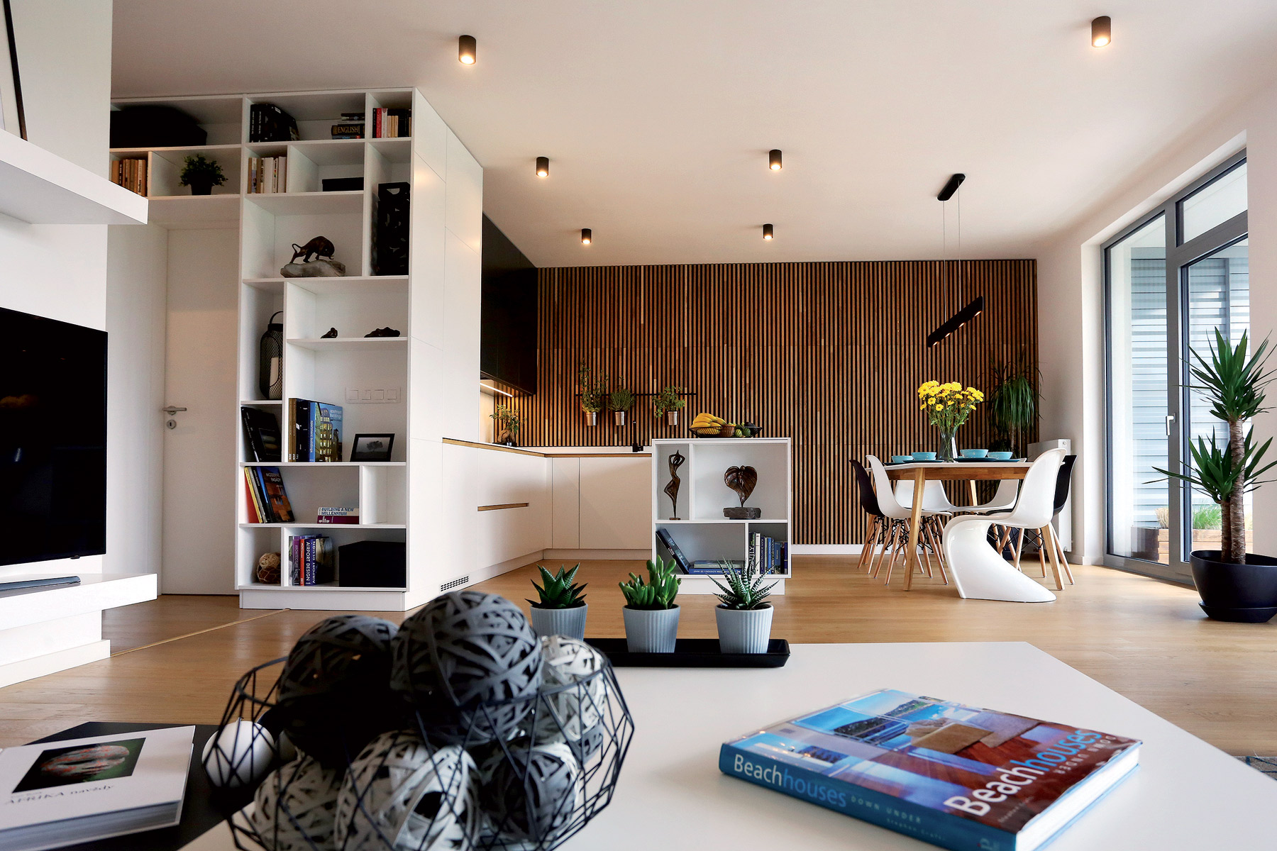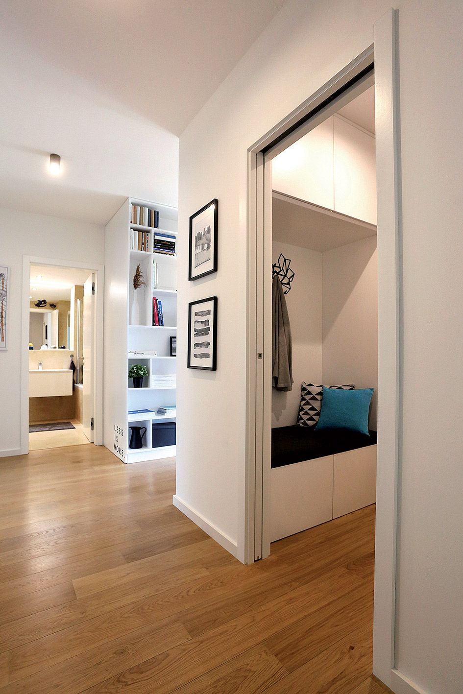 „Keď nie sú peniaze, musí nastúpiť kreativita,“ vyhlasuje architekt a upozorňuje na ďalšiu pýchu novovytvoreného priestoru – akýsi obrovský šatník s odkladacou skriňou a útulným sedením. To všetko sa dá zaťahovať dverami, čím sa vytvára hravé vlakové „kupé“ pre najmenšieho člena domácnosti. Azda najvýstižnejším slovom pre tento prístup k interiéru je personalizácia, pri ktorej každý autor narába s priestorom inak. Podľa predstáv, ale aj pragmatizmu.