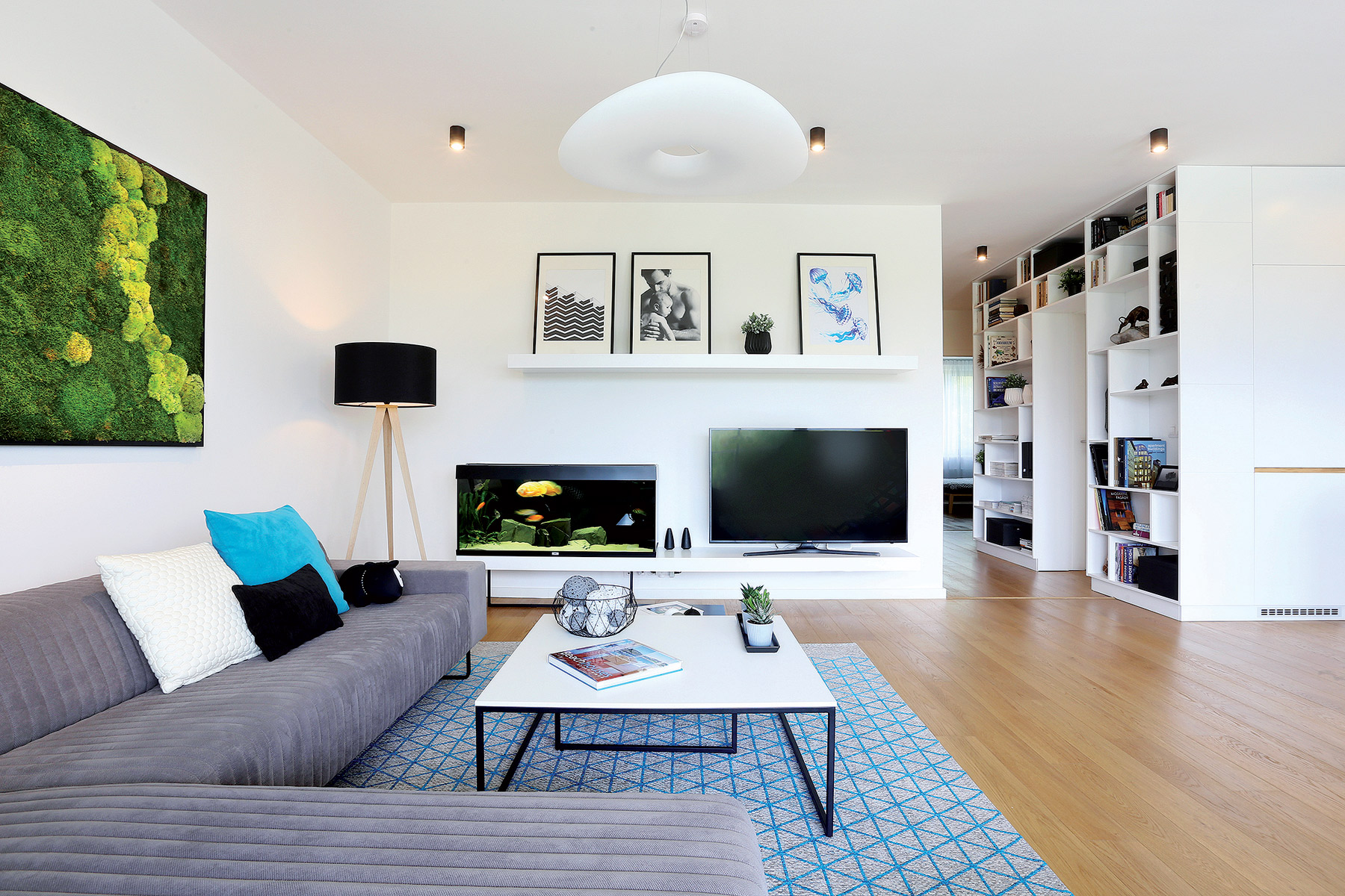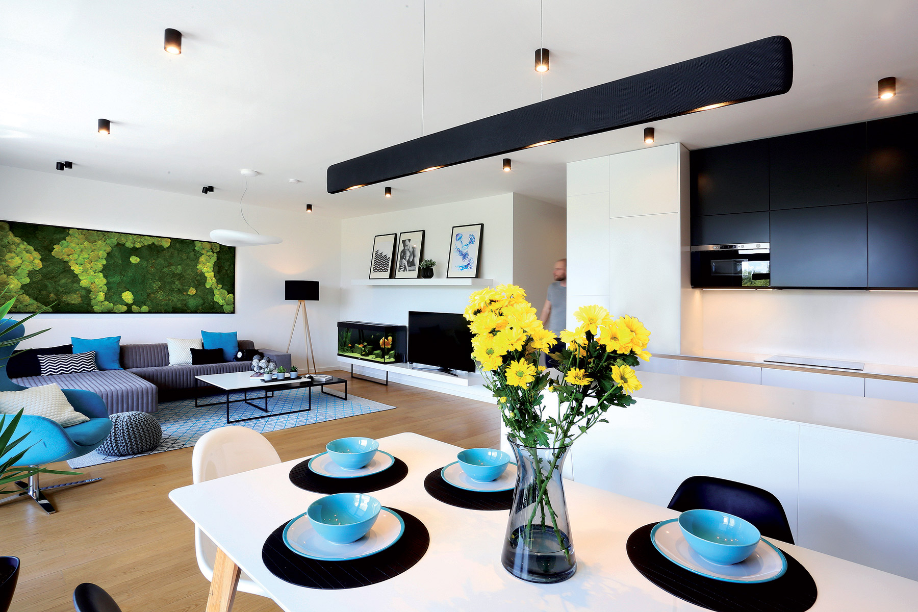 Aj preto je ústredným stanoviskom pri hlavnom výhľade na prírodnú scenériu s vodnými hladinami najväčší priestor v byte – obývačka so sedačkou, pri lepšom počasí pomerne rozľahlá terasa so sedením. Tradičný stredobod obývačiek – televízor – je odsunutý do úzadia, lebo na ten pri týchto „panorámach“ jednoducho nie je čas. Obývačka je zároveň najrozmaľovanejšia, bielu na stene a hnedú na prírodnej dubovej podlahe dopĺňa tyrkysová na sedačke a v doplnkoch.