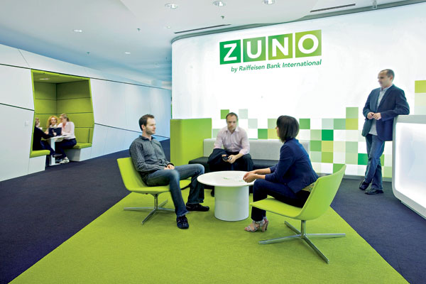 Spoločnosť ZUNO je dcérskou firmou rakúskej Raiffeisen Bank International a zaoberá sa internetovým bankovníctvom. Slovenský trh si vybrala ako prvý vo svojej expanzii do krajín strednej a východnej Európy a vo svojej filozofii podporuje čo najbližší vzťah ku klientovi. Ten má byť súčasťou bankových operácií, má mať transparentný prehľad nad svojimi vecami. Zamestnanec nie je za sterilnou priehradkou, ale sedí vedľa klienta. „Aj preto sme z interiéru vylúčili priečky oddeľujúce jednotlivé pracovné tímy a zvolili princíp otvorenosti, v ktorom sa ľahko komunikuje,“ približuje dizajnový koncept Boris Schultz.