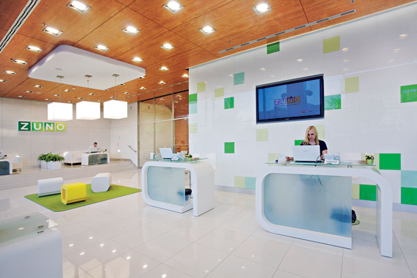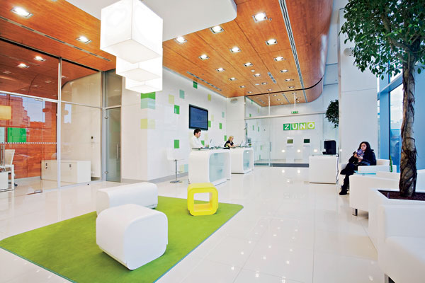 Interiér pripomínajúci obývačku, rokovacie búdky inšpirované tvarom africkej toguny, dôsledné dodržanie princípu tzv. open space stierajúci hranice v hierarchii spoločnosti, ale aj medzi pracovníkmi banky a klientmi, a to všetko v sviežich zelených farbách, ktoré na návštevníka pôsobia aktivizujúco. Dizajn interiéru centrály spoločnosti ZUNO v bratislavskom Digital Parku naznačuje nový trend dizajnu kancelárií. „Vedenie spoločnosti chcelo štýl hi-tech, ale s ľudským rozmerom,“ hovorí autor návrhu interiéru Boris Schultz. „A tak sme sa o to pokúsili...“