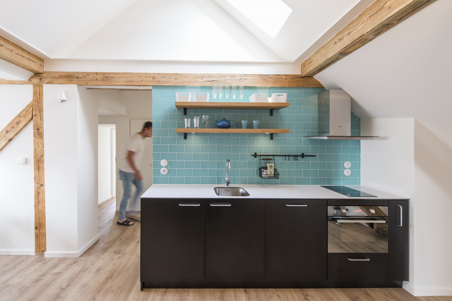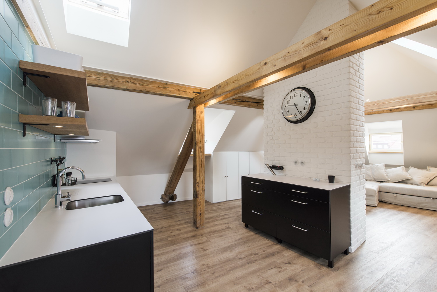 Návrh sa opiera o krásu priestoru „na povale“ a zároveň ho dopĺňa o nutné vybavenie v jemnom industriálnom štýle, ktorý reprezentuje priznaná neomietnutá tehlová stena – biely náter jej dodáva nádych čistoty, biela súčasne presvetľuje podkrovný priestor.