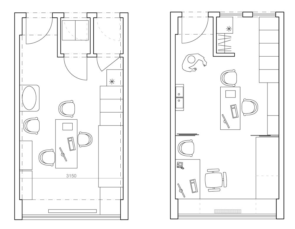 Hlavnou dispozičnou zmenou prešla organizácia sedenia lekárky a sestry. Nový lekársky stôl umiestnili na pravú stranu pri okne, je tak odčlenený od hlavného priestoru. Vzniklo útulné prostredie na pokojnejšiu prácu. To bola zároveň aj jedna z hlavných požiadaviek klientky. Dvere ani stena neboli vzhľadom na malý priestor prípustné. Závesom na koľajniciach, ktorý korešponduje s nábytkom i podlahou, je možné priestor úplne oddeliť. Zároveň prepúšťa dostatok svetla aj na stôl v strednej časti miestnosti. Tento stôl je masívnejší s bočným sedením pre pacienta.