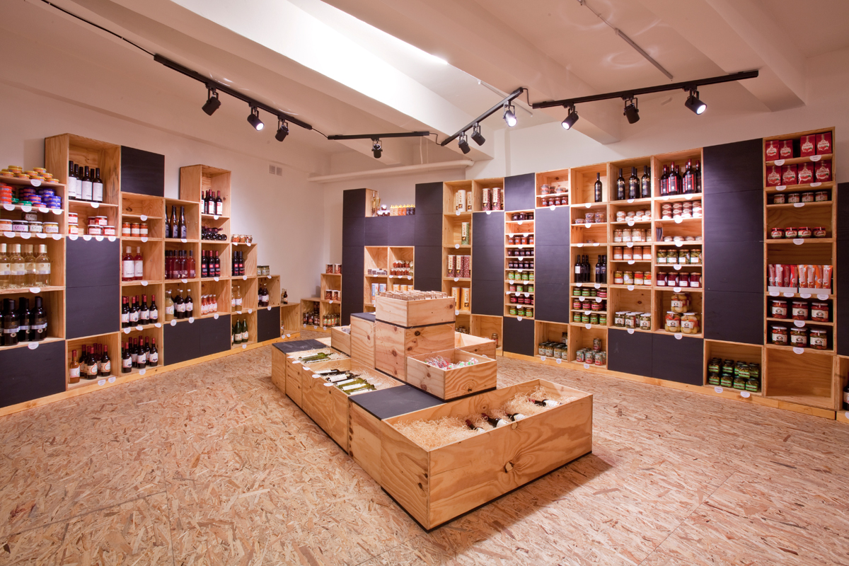 V suteréne sa nachádzajú potraviny. Regály sú vyskladané z kociek, ich čierna zadná strana tvorí názov podniku. Sú položené na mobilných podvozkoch, akýchsi „skateboardoch”, ktoré umožňujú pohyb nábytku. Mobilita dovoľuje v priestoroch organizovať rôzne eventy a otočením regálov uchrániť tovar pred odcudzením.