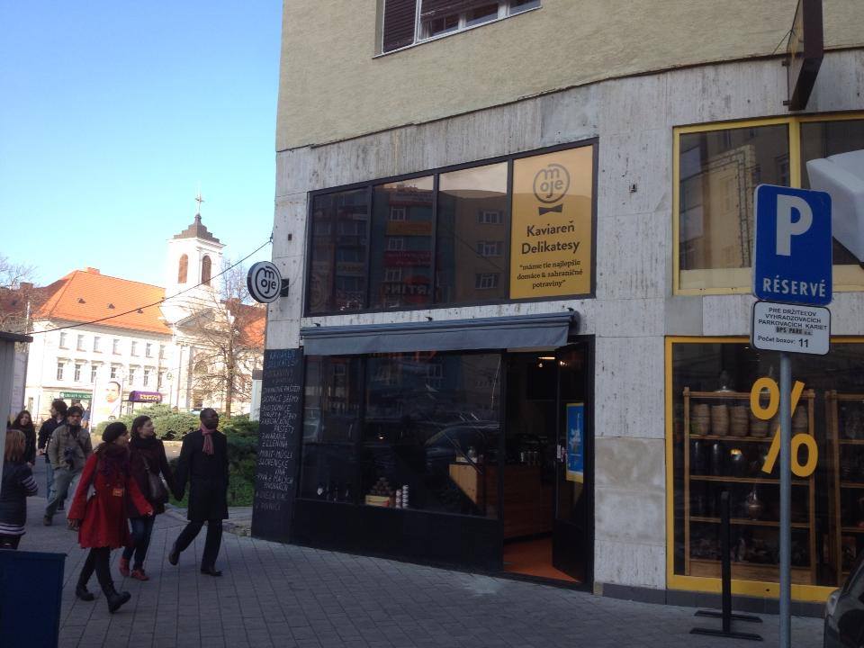Moje nájdete v Bratislave na začiatku Dunajskej ulice. Nachádza sa v parteri sedempodlažného bytového domu, ktorý odolal asanáciám na Kamennom námestí. Priestor bol pôvodne foyer banky, neskôr bol rozdelený na menšie časti Svetom zdravia. Z exteriéru Moje láka pekným bannerom a tabuľou s aktuálonou ponukou. V lete sa tu nachádza miniterasa, ktorú pred slnkom charáni markíza.