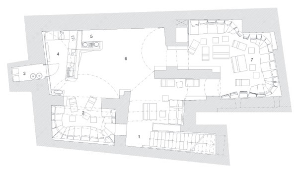 Pôdorys 1. pp: 1 – vstupné schodisko, 2 – vip sedenie, 3 – sklad, 4 – bar, 5 – dj place, 6 – tanečná plocha, 7 – lightroom