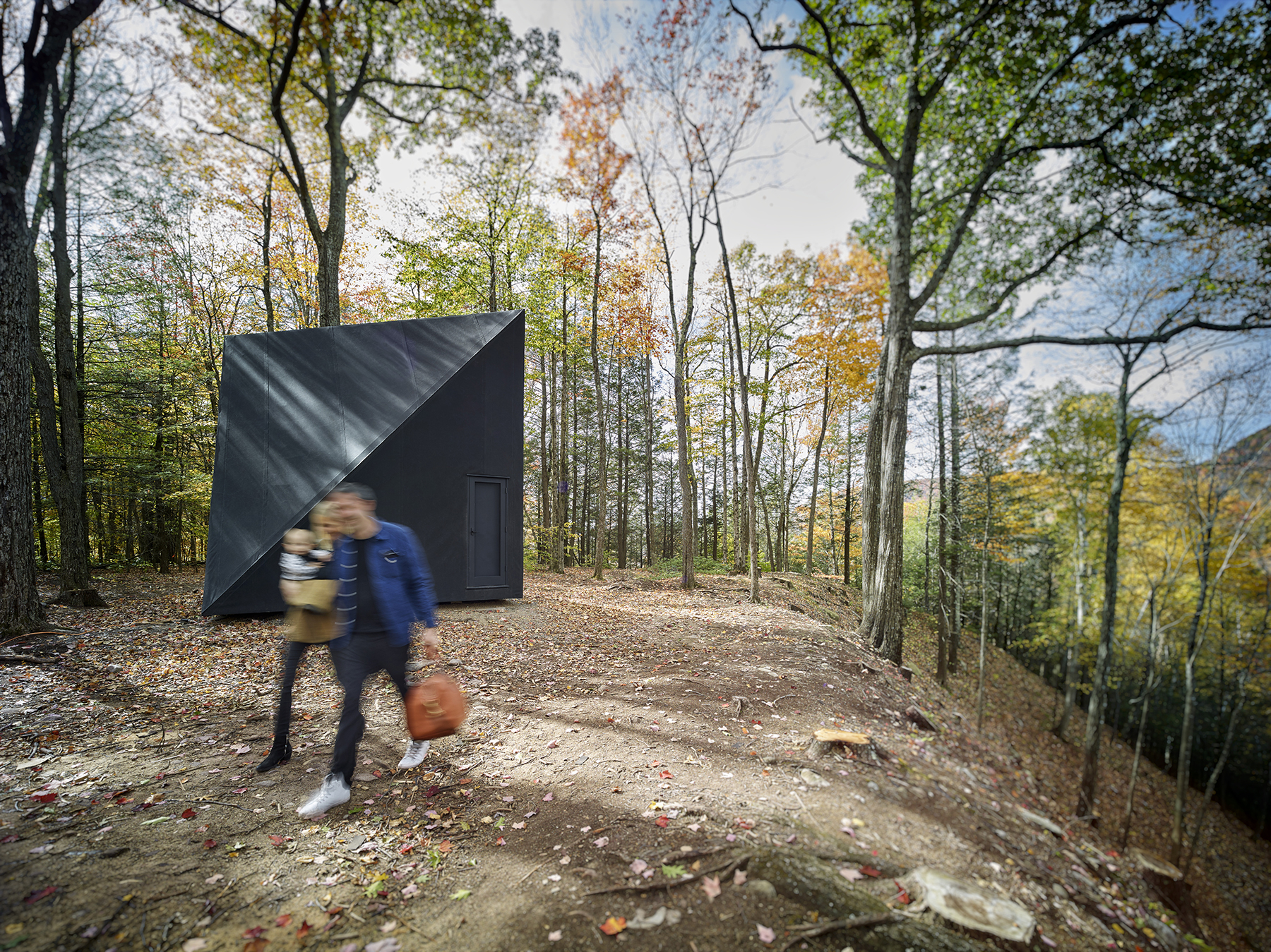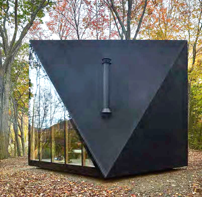Trojuholníkové steny chatky sú vyrobené z tmavého borovicového dreva. Napriek výraznému geometrickému tvaru, vďaka ktorému vidíte z každej strany trojuholník, je pôdorys chatky štvorcový. Šikmá strecha a šikmé steny umožňujú jednoduchý odtok dažďovej vody.