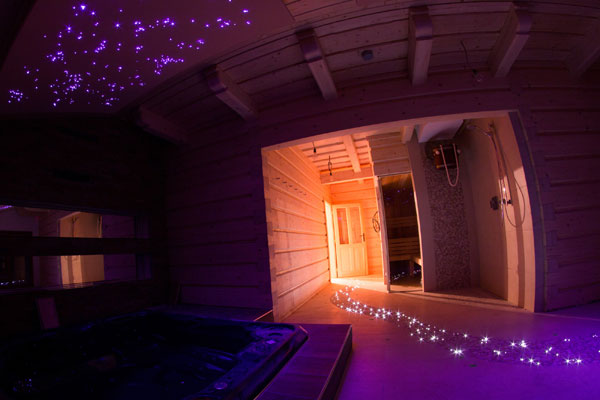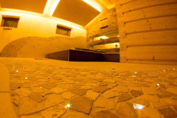 Mozaiková ulička v tomto welnes je dlhá cca 8m a jedinou požiadavkou bolo zosúladenie technologických postupov dlažbárov s prácou opto-technikov. Tento efekt jemného hviezdneho neba sa podarilo vyhotoviť za necelý deň a celkový efekt svetelnej uličky nemá spotrebu ani 5W!