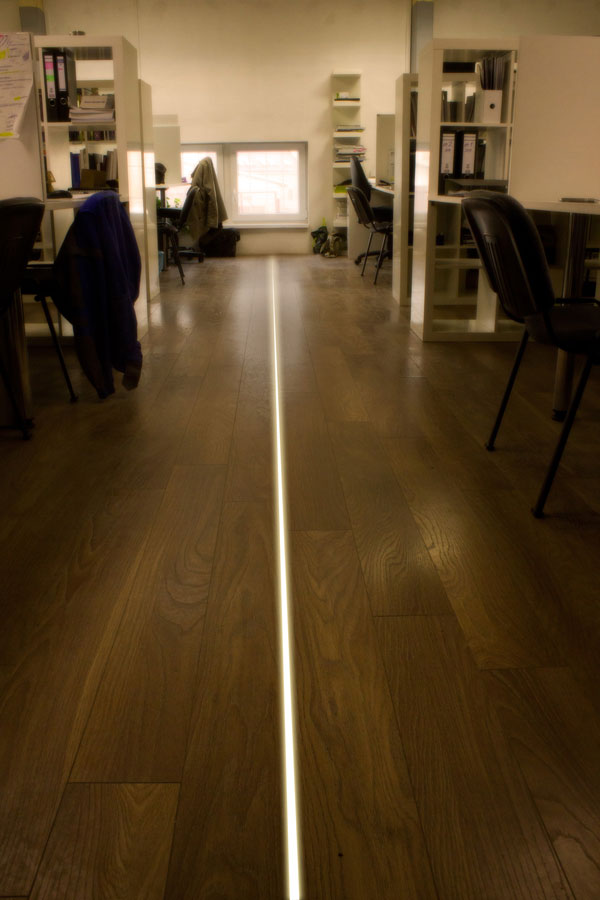 V prípade, že optotechnika nie je pre vás ideálna, je priestor možné oživiť dokonalou svetelnou líniou v podlahe alebo tesne nad ňou napr. v sokli. Použitím LED pásov s dobrým farebným spektrom (pozor na hobby riešenia odtieňov bielej často v rúžovom či modrom spektre!), vhodného profilu a kvalitného pochôdzneho difúzora (až do 500kg!) s dokonalou difúziou svetla, docielite nevtieravé a energeticky nenáročné osvetlenie priestoru. Prakticky nekonečné línie môžu byť v príjemnej bielej farbe pre zladenie s interiérom alebo môžu disponovať najrôznejšími funkciami ako RGB/farebné efekty, inteligentné biodynamické osvetlenie, RGB+W atď.)