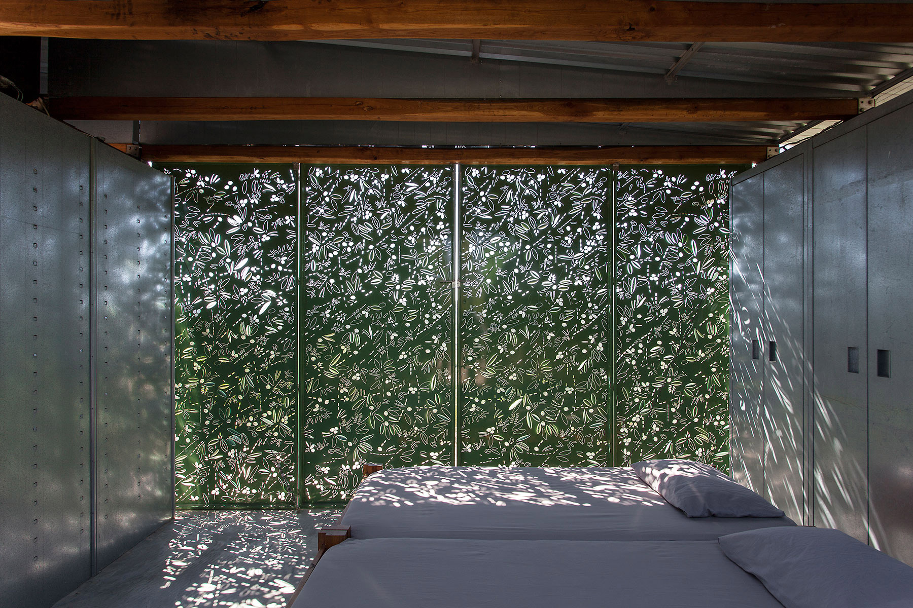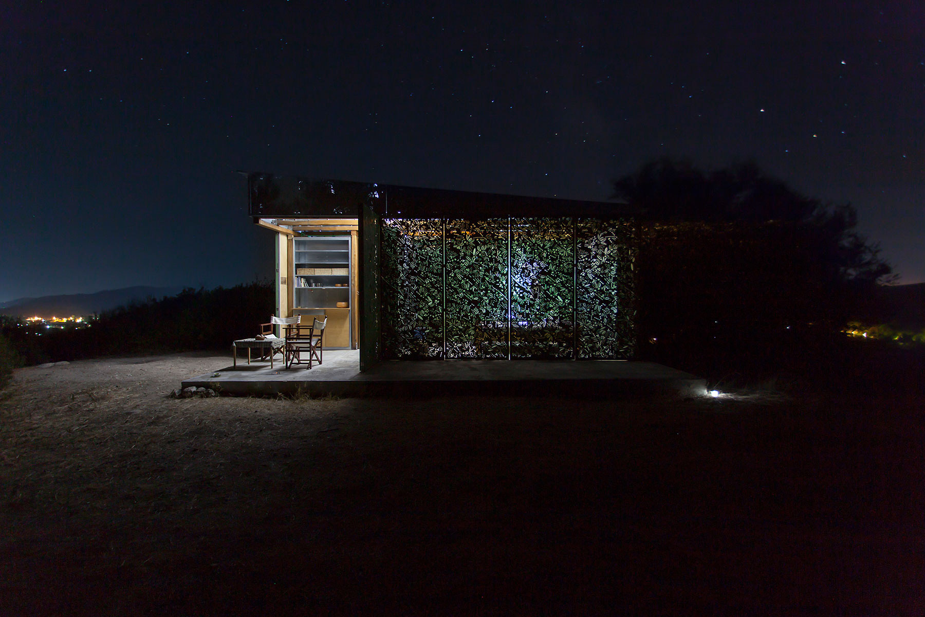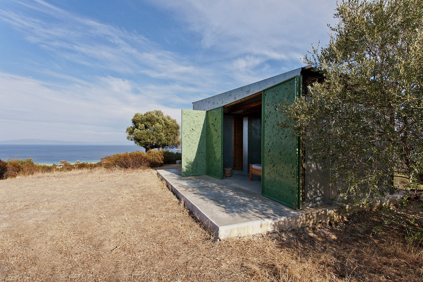 Fascinujúci je už samotný vonkajší „obal“ letného domu, ktorý tvorí len ľahký kov. Obopína základnú štruktúru domu a dá sa prispôsobiť potrebám obyvateľov – je ho možné flexibilne upraviť. Perforovaný vzor symbolizuje okolité olivové stromy, rovnako ako aj farba.