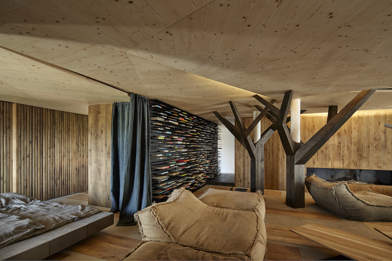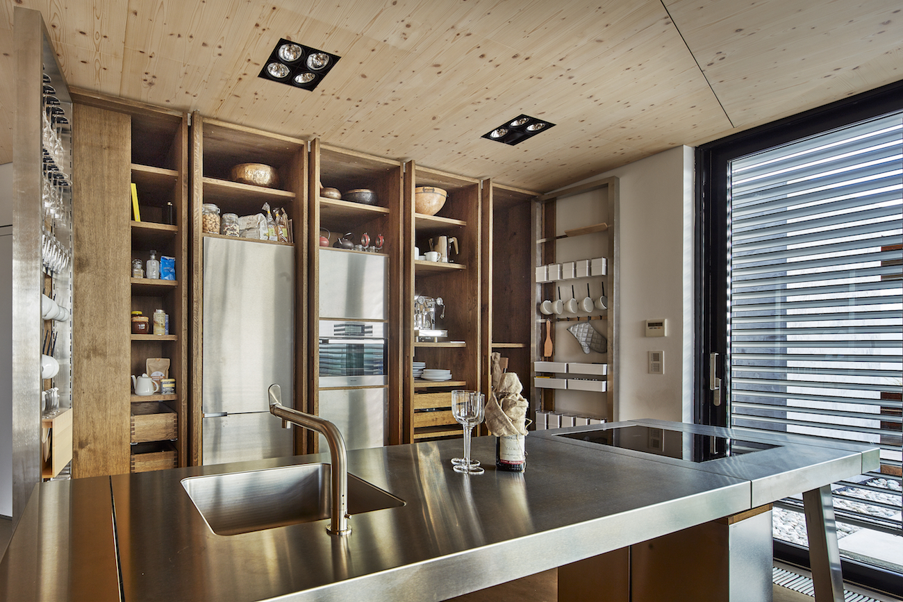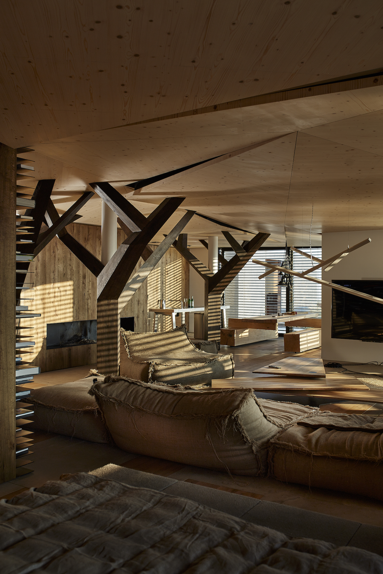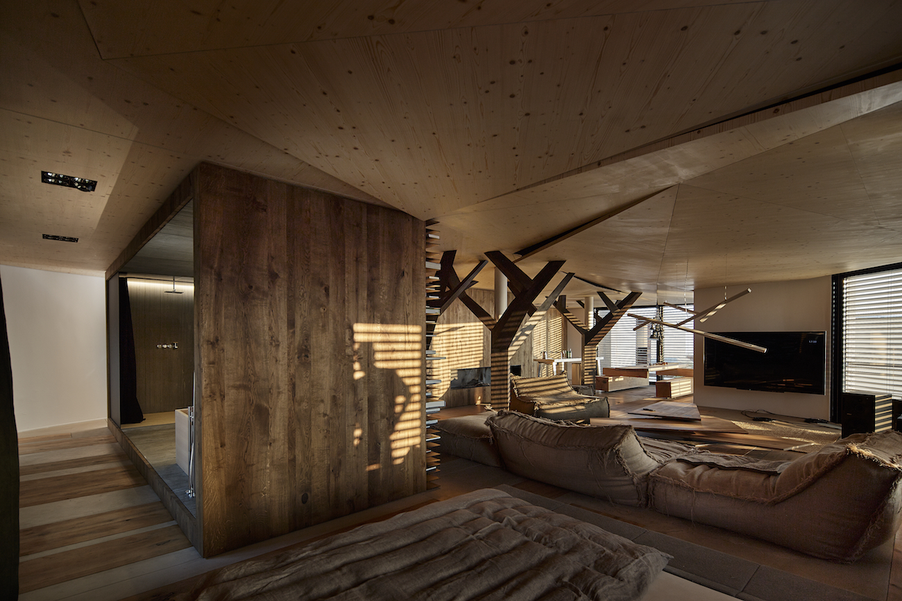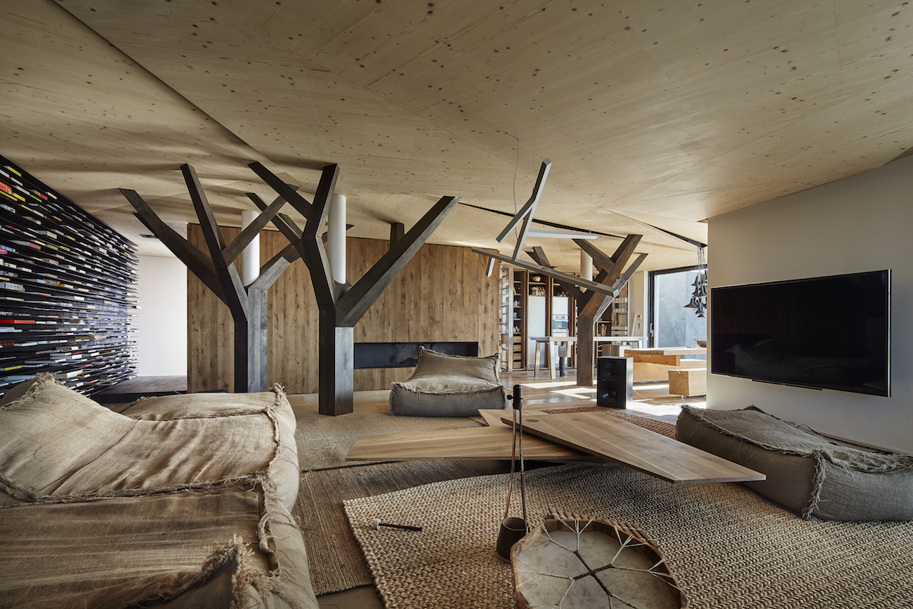 V kombinácii s masívnymi povrchmi a atypickým zariadením, ako sú napríklad na mieru vyrobený horizontálny kozub, drevené abstraktné stromy, ktoré „vyrástli“ na mieste nosných stĺpov, a stena plná „vznášajúcich sa kníh“, poskytuje tento, ako ho s úsmevom nazývajú architekti, „dvojizbový byt“ jedinečnú atmosféru a zážitok z priestoru.