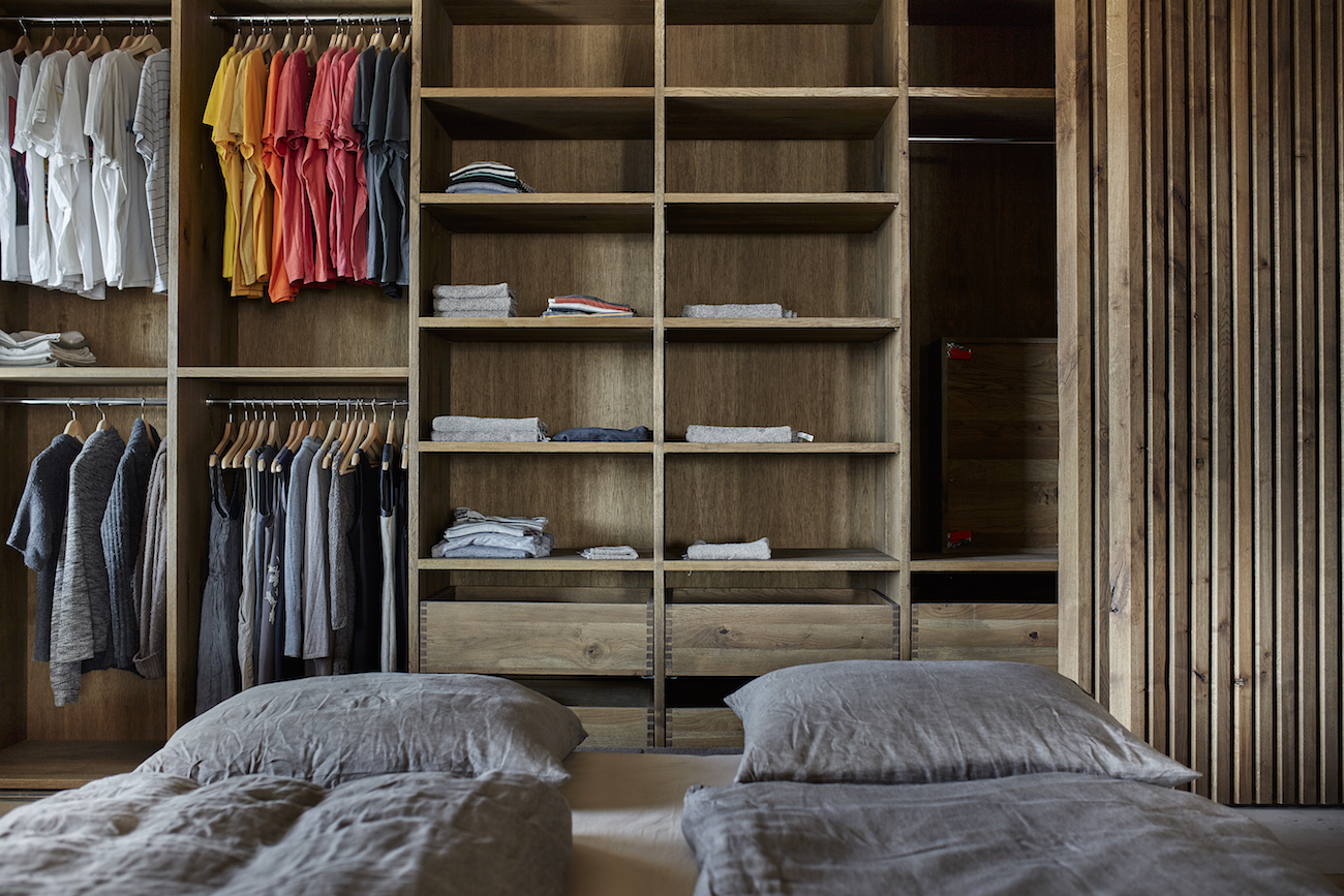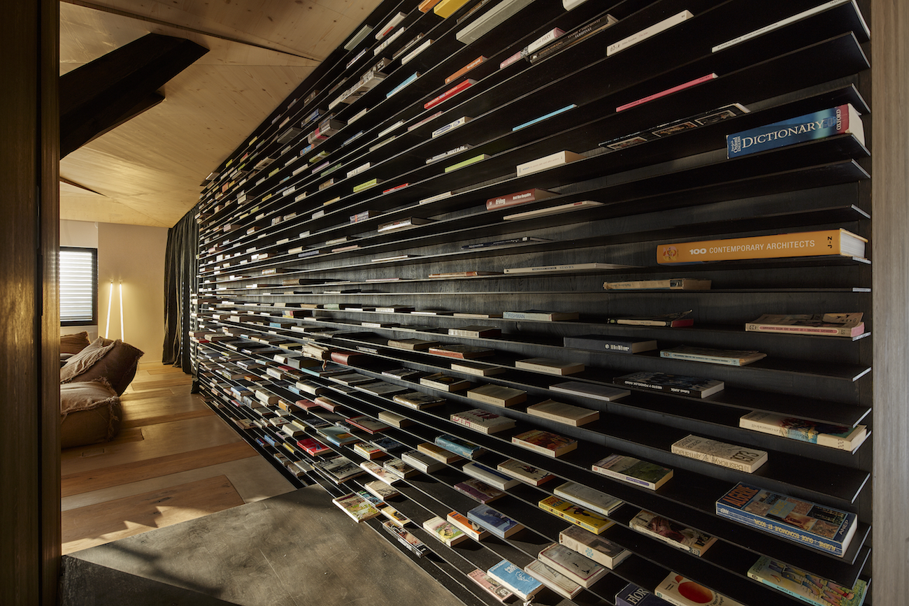 Už spomínaná atypická knižnica je taktiež vyrobená na zákazku ako väčšina nábytku v tomto nezvyčajnom byte a okrem ukladania kníh slúži zároveň aj ako predel medzi obývacou časťou priestoru a kúpeľňou.