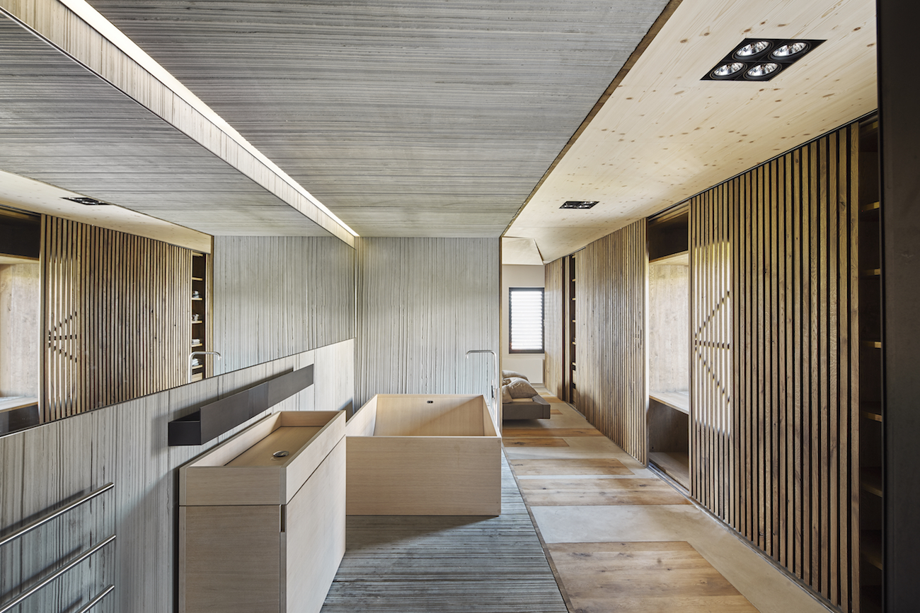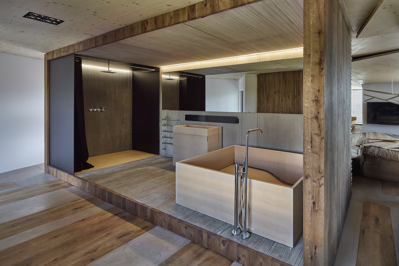 Pocit otvorenosti, ktorý je najcharakteristickejším momentom tohto luxusného bývania, umocňujú dva základné prvky: súvislá betónová podlaha s dubovými doskami rôznych rozmerov nepravidelne rozmiestnených po celej ploche a tektonicky polámaný priebežný drevený strop.