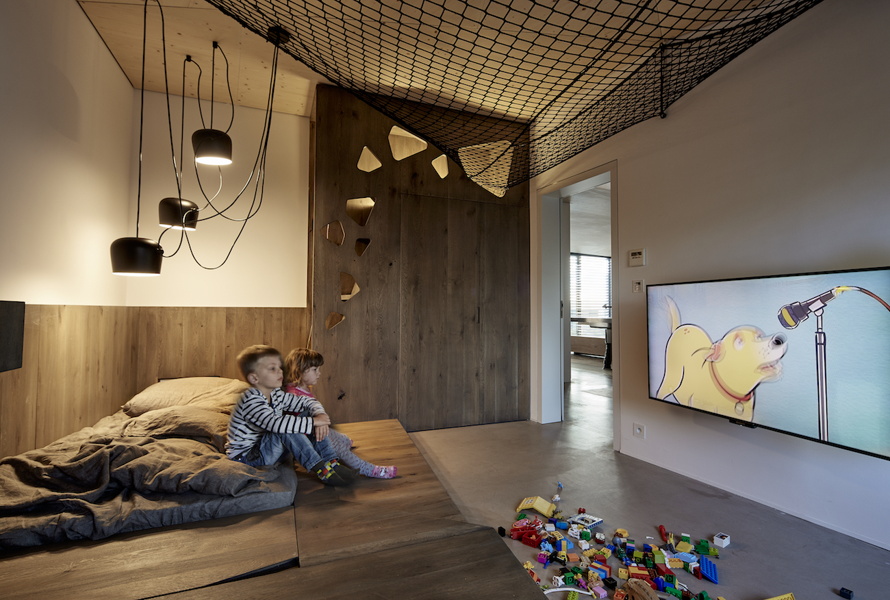 Nezvyčajne je riešená aj detská izba s textilnou sieťou pod stropom, ktorá poskytuje svojmu obyvateľovi dokonalý vlastný svet.
