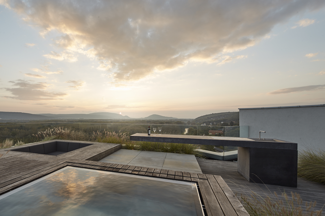 Pobyt vonku po praktickej stránke spríjemňuje betónový bar s drezom a pohovka na posedenie s priateľmi.
