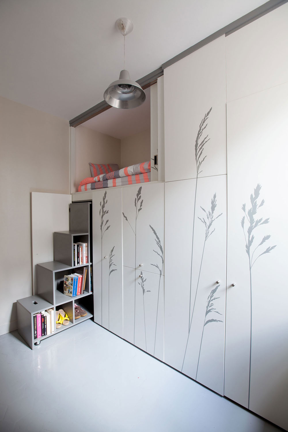 Vďaka konceptu švajčiarskeho armádneho vreckového nožíka, ktorý je svetoznámy pre svoju maximálnu funkcionalitu, sa im podarilo svoje zadanie splniť na sto percent. Profesionáli zvolili modulárny systém obrovskej vstavanej ”skrine‟, ktorá spĺňa maximum funkcií. Ukrýva posteľ, stôl, ktorý slúži ako pracovňa aj jedálenský kút, 2 stoličky, knižnicu, šatník, poličky na rôzne potrebné drobnosti či bielizeň. Okolo okna je vytvorený malý kuchynský kút. Oddelená kúpeľňa obsiahla všetko potrebné – WC, sprchový kút aj umývadlo.