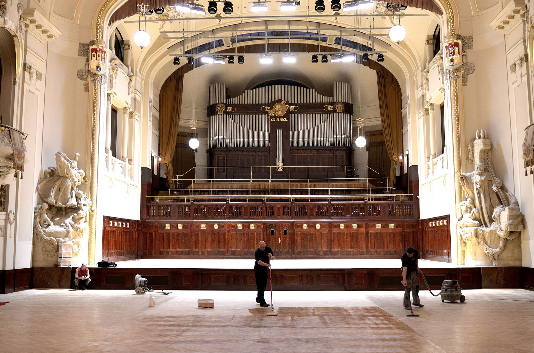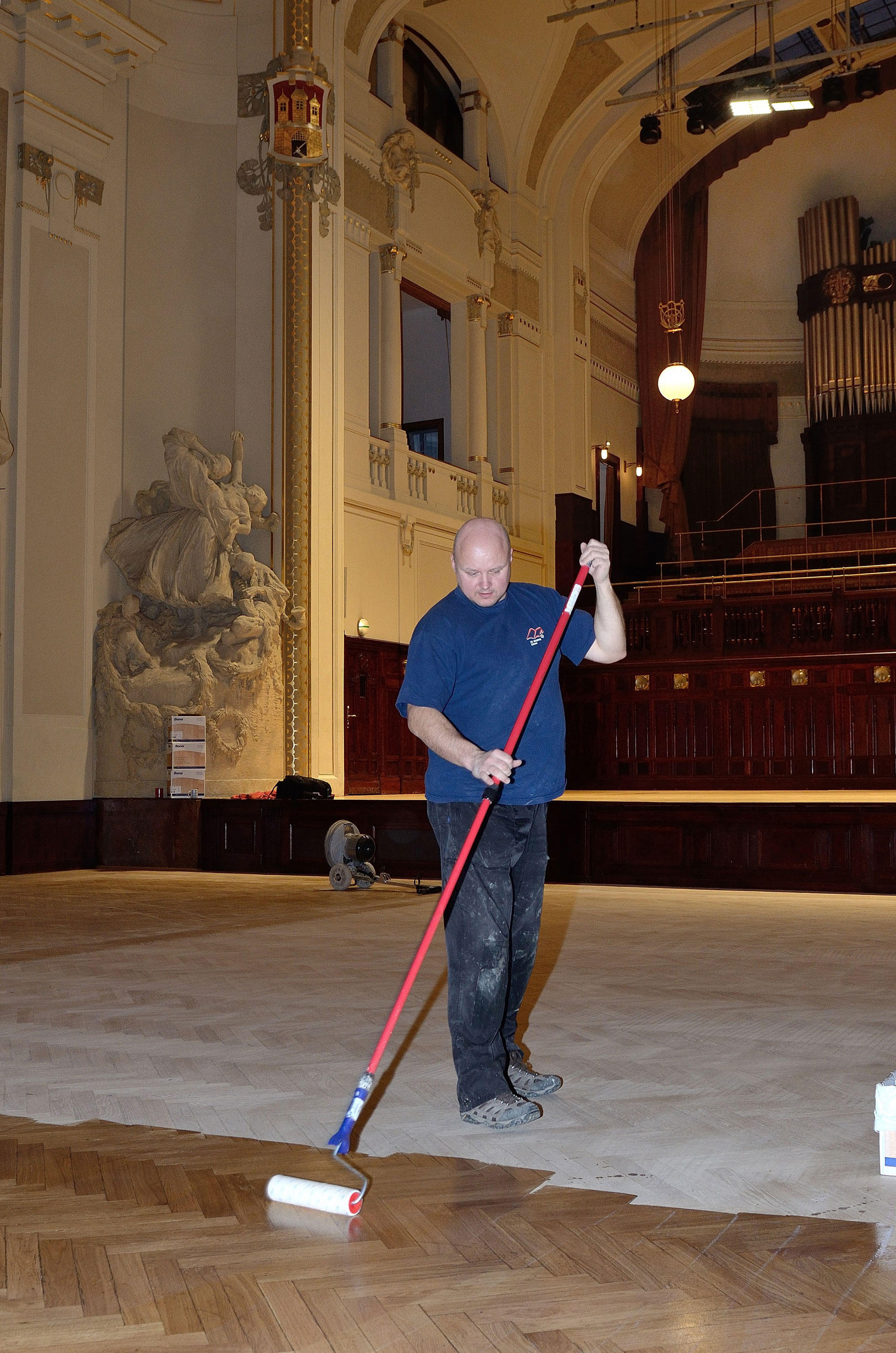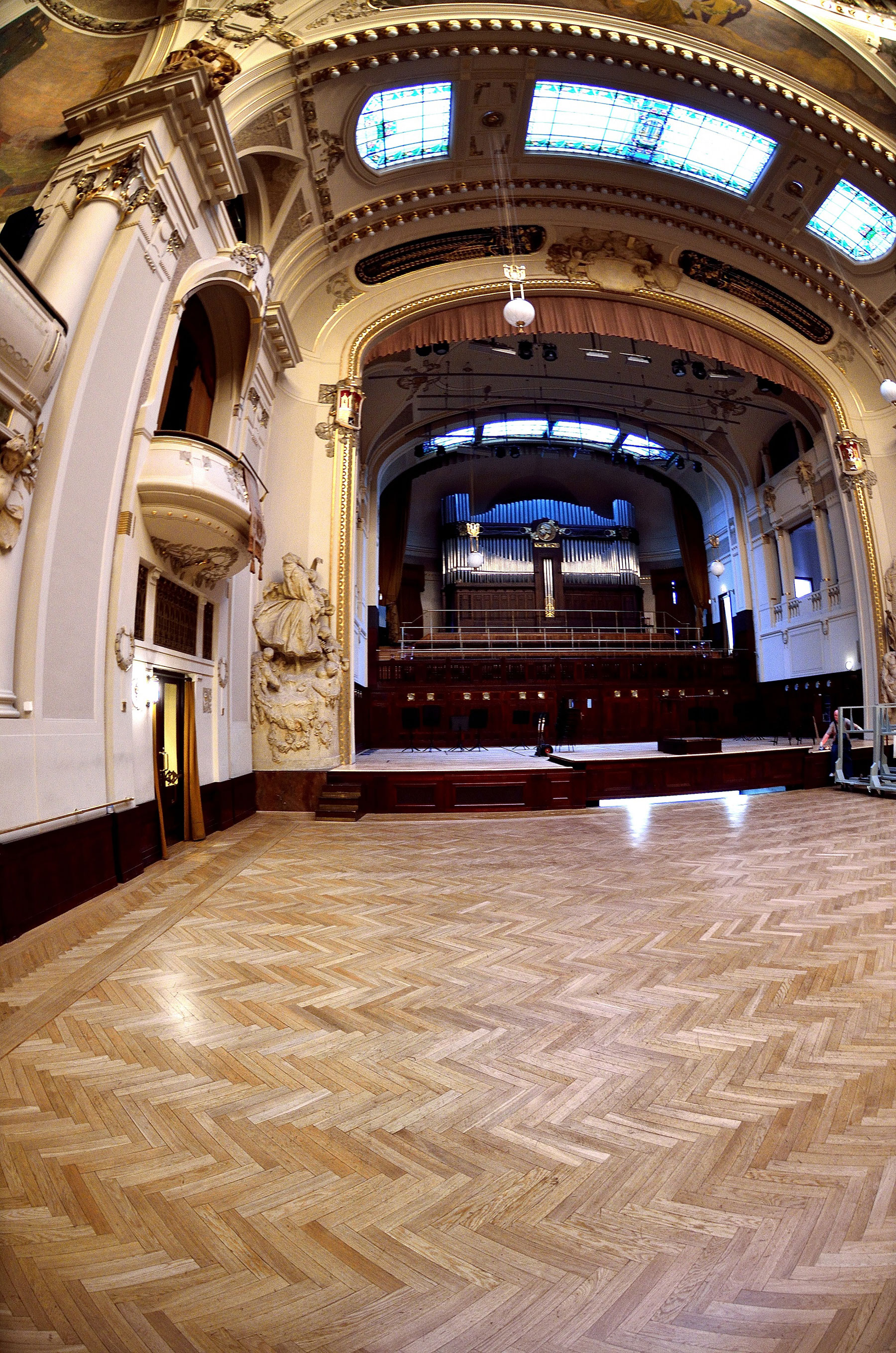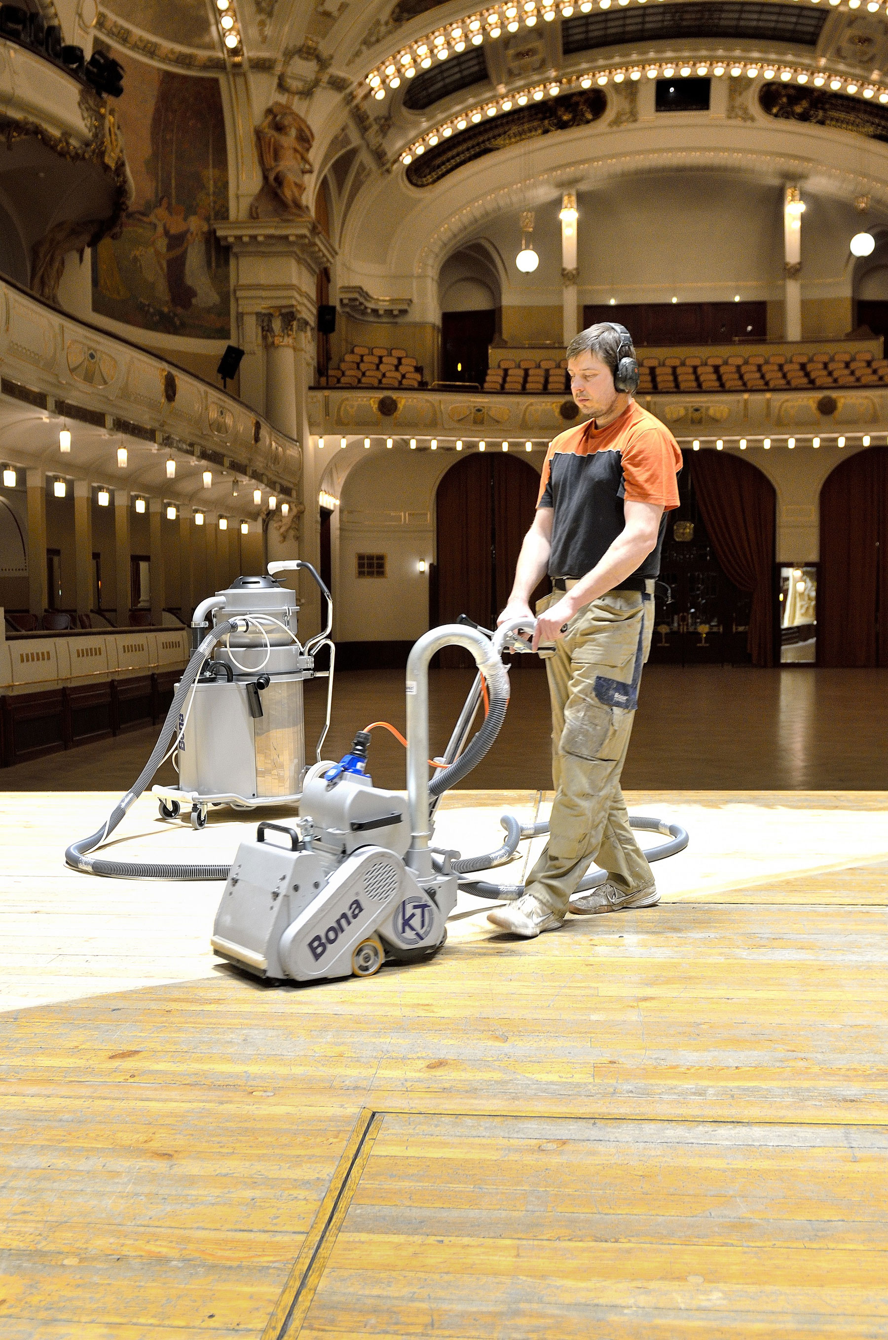 V rovnakom čase prebiehalo hĺbkové čistenie čistiacim strojom Bona Power Scruber v kombinácii s prípravkom Bona Deep Clean Solution v hlavnej sále Smetanovej siene. Bolo nutné realizovať aj drobné opravy podlahy a výmenu niekoľkých bordúr. Celá plocha bola následne prebrúsená diamantovým brúsivom Bona so zrnitosťou P120 a prelakovaná jednou vrstvou laku Bona Traffic HD. 24 hodín po aplikácii posledného laku tu už prebiehala dlho dopredu objednaná akcia.