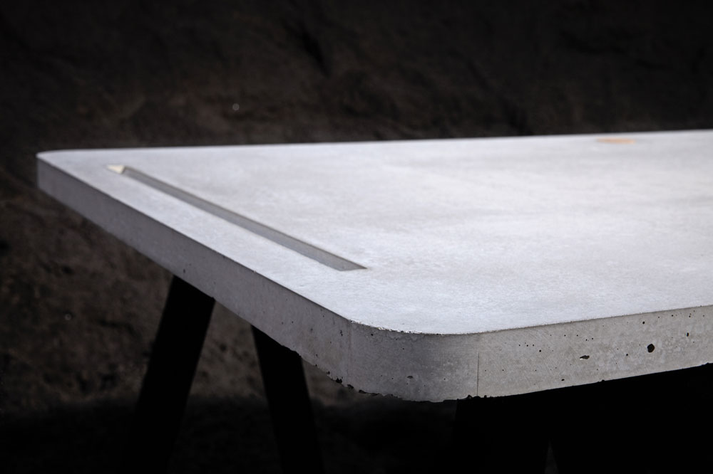 Receptúra betónu na zhotovenie dosky stola vychádza z návrhu ľahkého samozhutniteľného betónu. Na zvýšenie estetického vzhľadu sa ako prísada použil biely anorganický pigment Pretiox PK 60. Pigmenty v samozhutniteľnom betóne zvyšujú nevyhnutný podiel jemných častíc a duplicitne tokové vlastnosti čerstvého betónu. Navrhnutá receptúra betónu s maximálnym zrnom kameniva 8 mm rešpektuje požiadavky na konštrukčný betón v pevnostnej triede LC 25/28, jednoduché hutnenie, objemovú stálosť zatvrdnutého betónu a vhodnú hmotnosť. Ako spojivo sa použil portlandský cement CEM I 42,5 R, ľahké kamenivo Liapor l-4/500 a Liapor 4-8/350 a ťažené kamenivo frakcie 0-4 Náklo. Ako prímes sa okrem pigmentu Pretiox PK 60 sa použila aj jemne mletá vysokopecná troska.