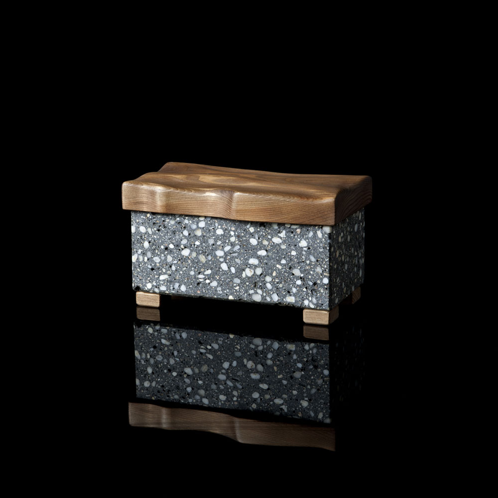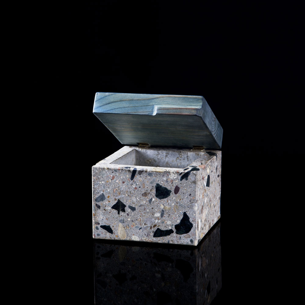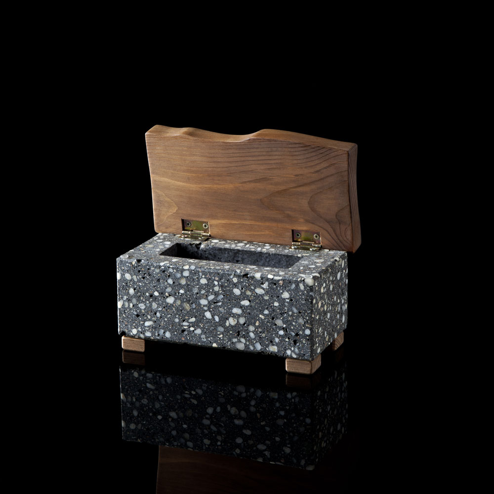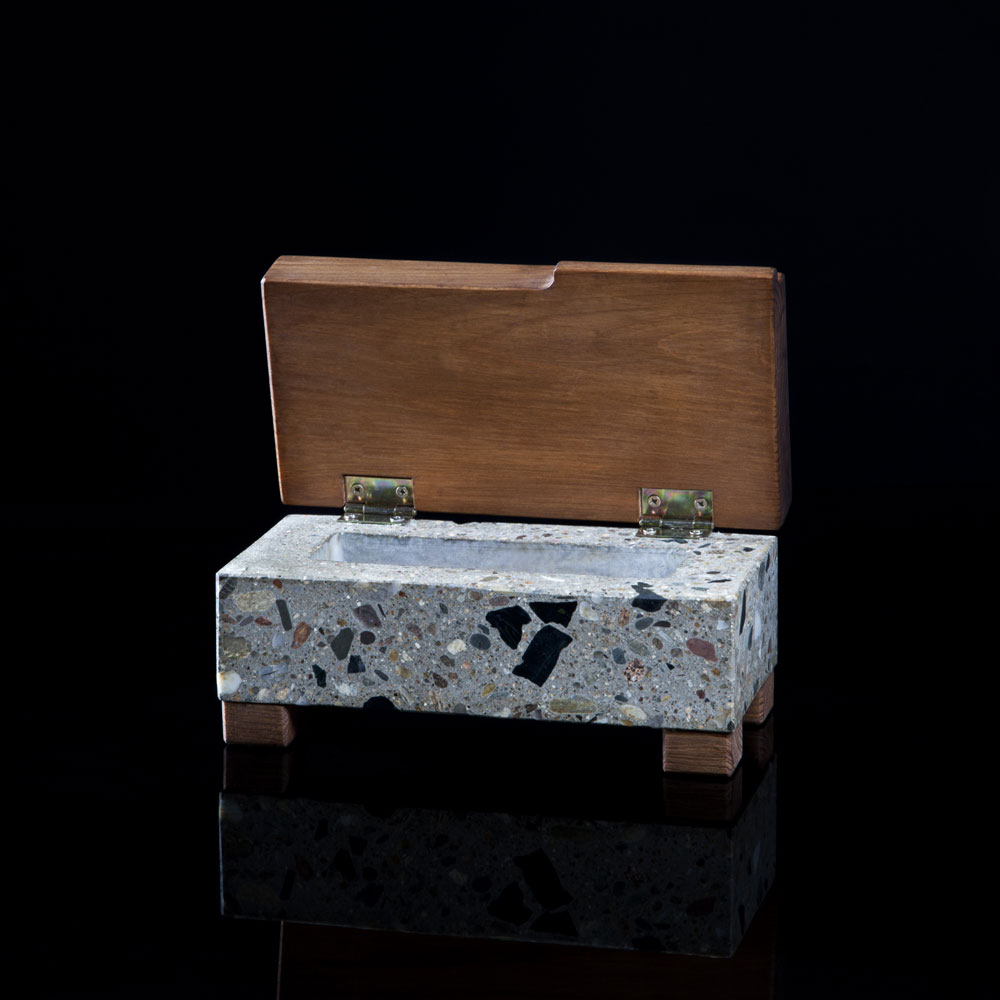 Betónová šperkovnica vyhotovená z pohľadového betónu. Z dôvodu vnesenia kontrastu do pohľadovej plochy sa použilo kamenivo rozličných frakcií a farieb a tmavé pigmenty anorganickej černi.