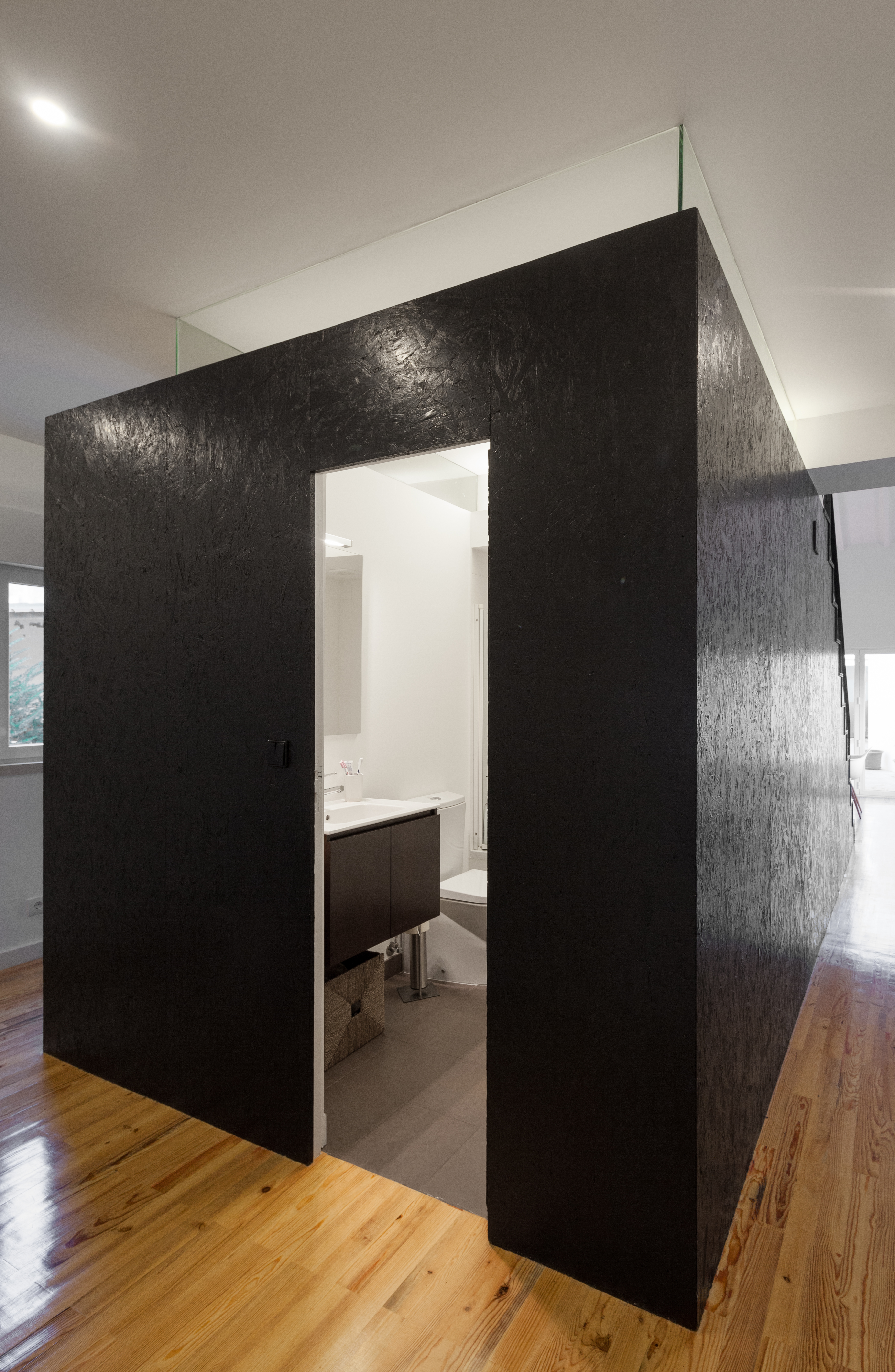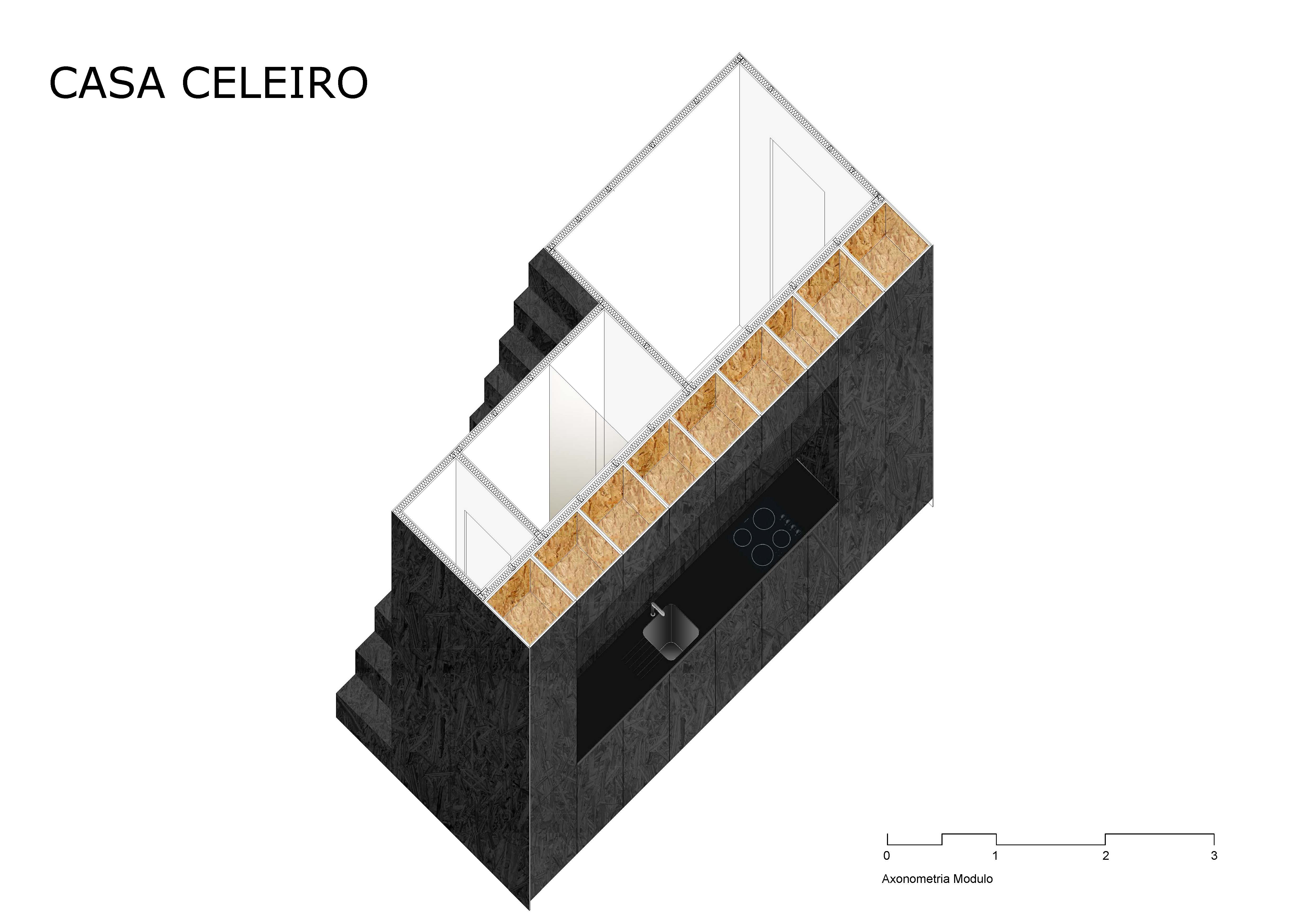 „Vedela som, že z tohto materiálu môžem realizovať všetko potrebné, čo má blok mať – steny, dvere, kuchynskú linku, úložné skrine, dokonca aj schody a podlahu v hornej časti modelu,“ vysvetľuje vo svojej správe k rekonštrukcii Inês Brandão. Zvolila typ OSB dosiek, ktorý je vhodný aj do vlhkých priestorov.