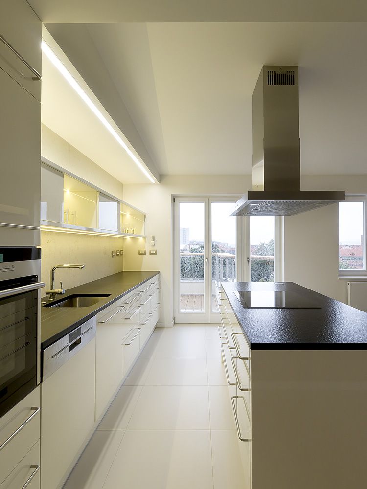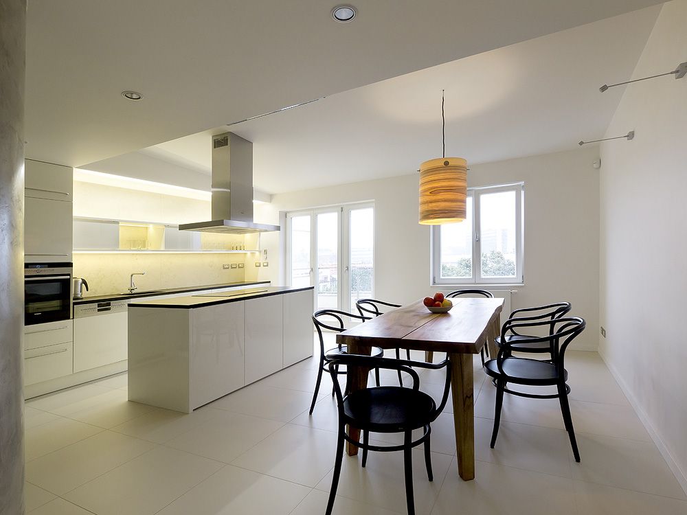 „Okrem zachovania nenápadného plynulého prepojenia hlavných častí loftu bol pre nás dôležitý výber materiálov,“ opisujú svoj zámer architekti. Jeden z takýchto príkladov kvalitných materiálov nájdeme v kuchyni v podobe pracovnej dosky z čiernej žuly a kontrastného obkladu zo svetlého nelešteného mramoru za ňou.